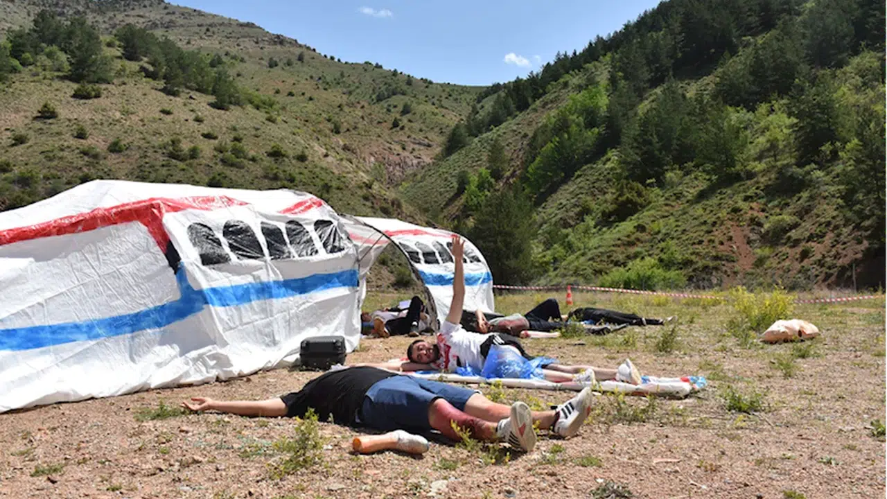 Senaryo gereği, uçağın enkazına ulaşan ekipler 14 yaralıyı bulundukları yerden alarak 112 Acil Sağlık ekiplerine teslim etti.