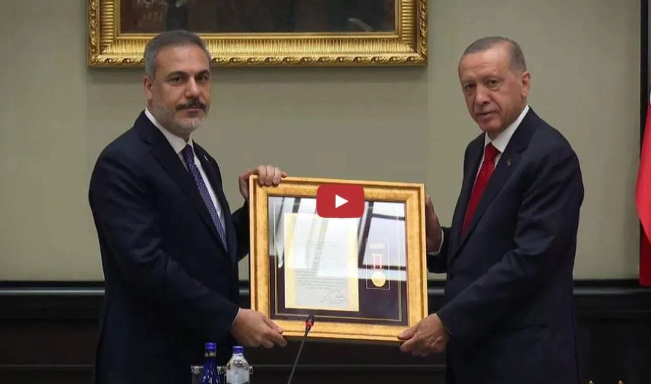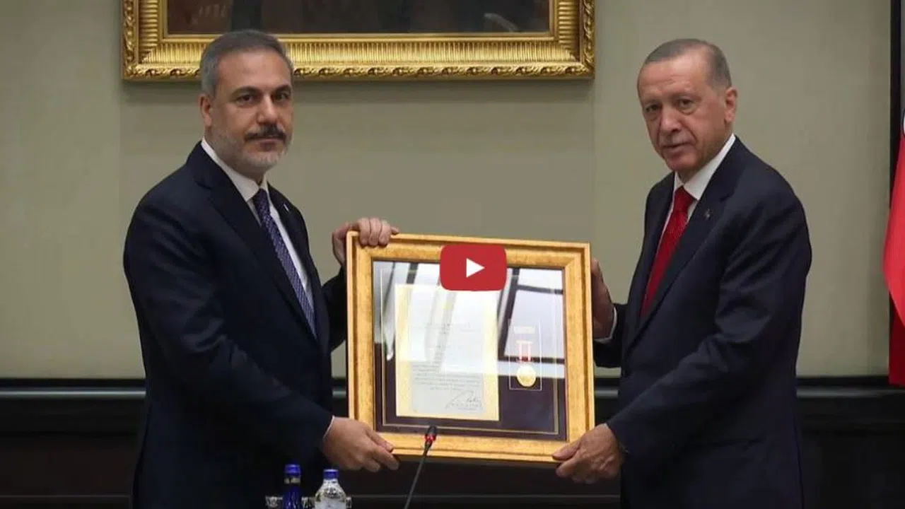 Cumhurbaşkanı Recep Tayyip Erdoğan, MGK'da Dışişleri Bakanı Hakan Fidan’a MİT'teki görevlerinden dolayı "Devlet üstün hizmet madalyası beratı" verdi.