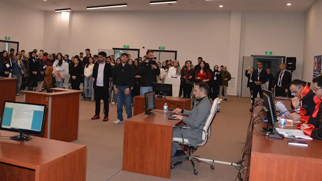 Salih TEKİN/ERZURUM, (DHA)- ERZURUM Atatürk Üniversitesi ev sahipliğinde bölge üniversitelerinin katılımıyla düzenlenen Kuzeydoğu Anadolu Kariyer Fuarı (KUDAKAF'25) kapsamında hukuk fakültesi öğrencilerine yönelik kurgusal duruşma düzenlendi. Erzurum Adliyesi 1'inci Ağır Ceza Mahkemesi başkan ve üyeleri ile savcının katıldığı kurgusal duruşmaya hukuk fakültesi öğrencileri büyük ilgi gösterdi. Hukuk Fakültesi Dekanı Prof. Dr. Reşat Karcıoğlu, "Gerçek hakim, savcı, avukatlar nezaretinde, gerçek olaymış gibi uygulama yapıldı" dedi.