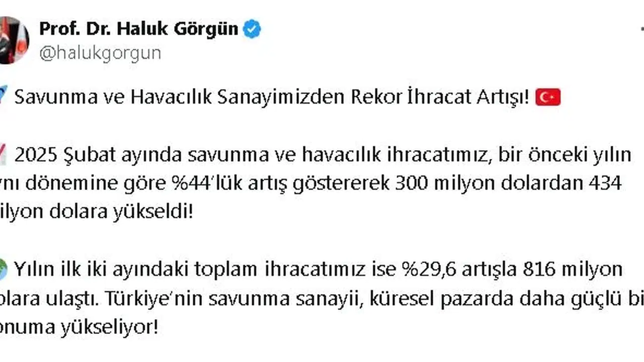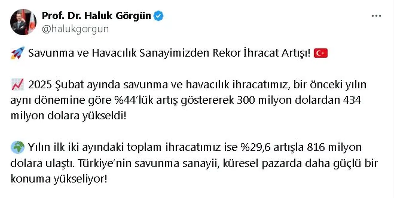 Savunma Sanayii Başkanı Haluk Görgün, sosyal medya hesabından yaptığı açıklamada, "Savunma ve havacılık sanayimizden rekor ihracat artışı. 2025 Şubat ayında savunma ve havacılık ihracatımız, bir önceki yılın aynı dönemine göre yüzde 44'lük artış göstererek 300 milyon dolardan 434 milyon dolara yükseldi. Yılın ilk 2 ayındaki toplam ihracatımız ise yüzde 29,6 artışla 816 milyon dolara ulaştı. Türkiye'nin savunma sanayii, küresel pazarda daha güçlü bir konuma yükseliyor" ifadelerini kullandı.