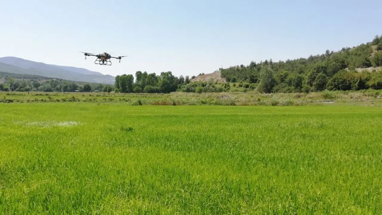 Dronla ilaçlama tekniği ilçede ilk kez uygulandı.