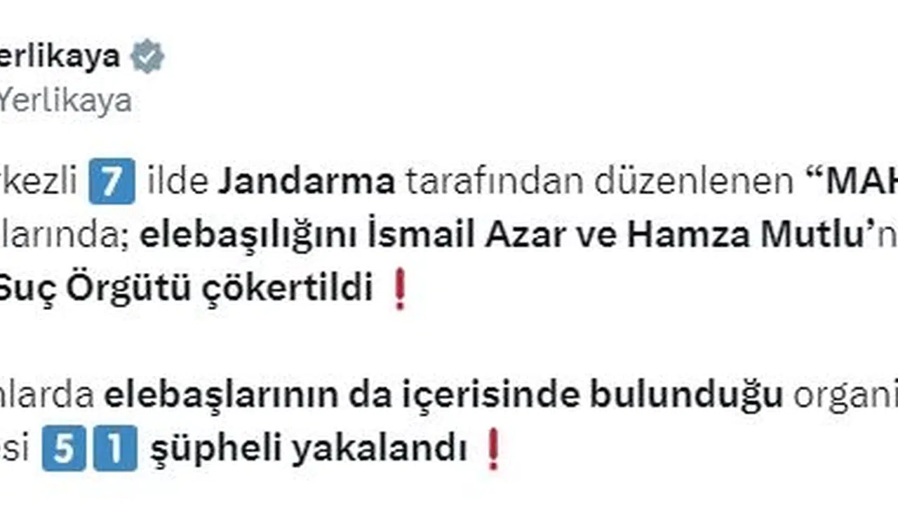 Bakan Yerlikaya, sosyal medya hesabından yaptığı açıklamada, Hatay Cumhuriyet Başsavcılığı ve Jandarma Genel Komutanlığı Kaçakçılık ve Organize Suçlarla Mücadele Daire Başkanlığı koordinesinde elebaşılığını İsmail Azar ve Hamza Mutlu'nun yaptığı organize suç örgütüne yönelik 7 ilde 'Mahzen-47' operasyonları düzenlendiğini belirtti. Buna göre; 'nitelikli dolandırıcılık', 'resmi belgede sahtecilik', 'rüşvet', 'kişisel verilerin hukuka aykırı kullanılması', 'görevi kötüye kullanma' ve 'Vergi Usul Kanunu'na muhalefet' suçlarını işleyen 51 şüpheli Hatay, Ankara, Antalya, Mersin, Nevşehir, Sivas ve Şanlıurfa'da yakalandı. Gözaltına alınanlar arasında örgüt elebaşları da yer aldı. Yapılan aramalarda çok sayıda ruhsatsız tabanca, suçta kullanıldığı değerlendirilen çok sayıda vekaletname, reçete, dekont ve senet ele geçirildi. Ayrıca Mali Suçları Araştırma Kurulu ve Adana Sosyal Güvenlik Kurumu Sağlık Denetim Ekibiyle yapılan ortak çalışmalar sonucu, 6 bin 532 usulsüz olarak düzenlenmiş noter vekalet belgesinin kullanıldığı ve kamunun yaklaşık 1 milyar lira zarara uğratıldığı tespit edildi.