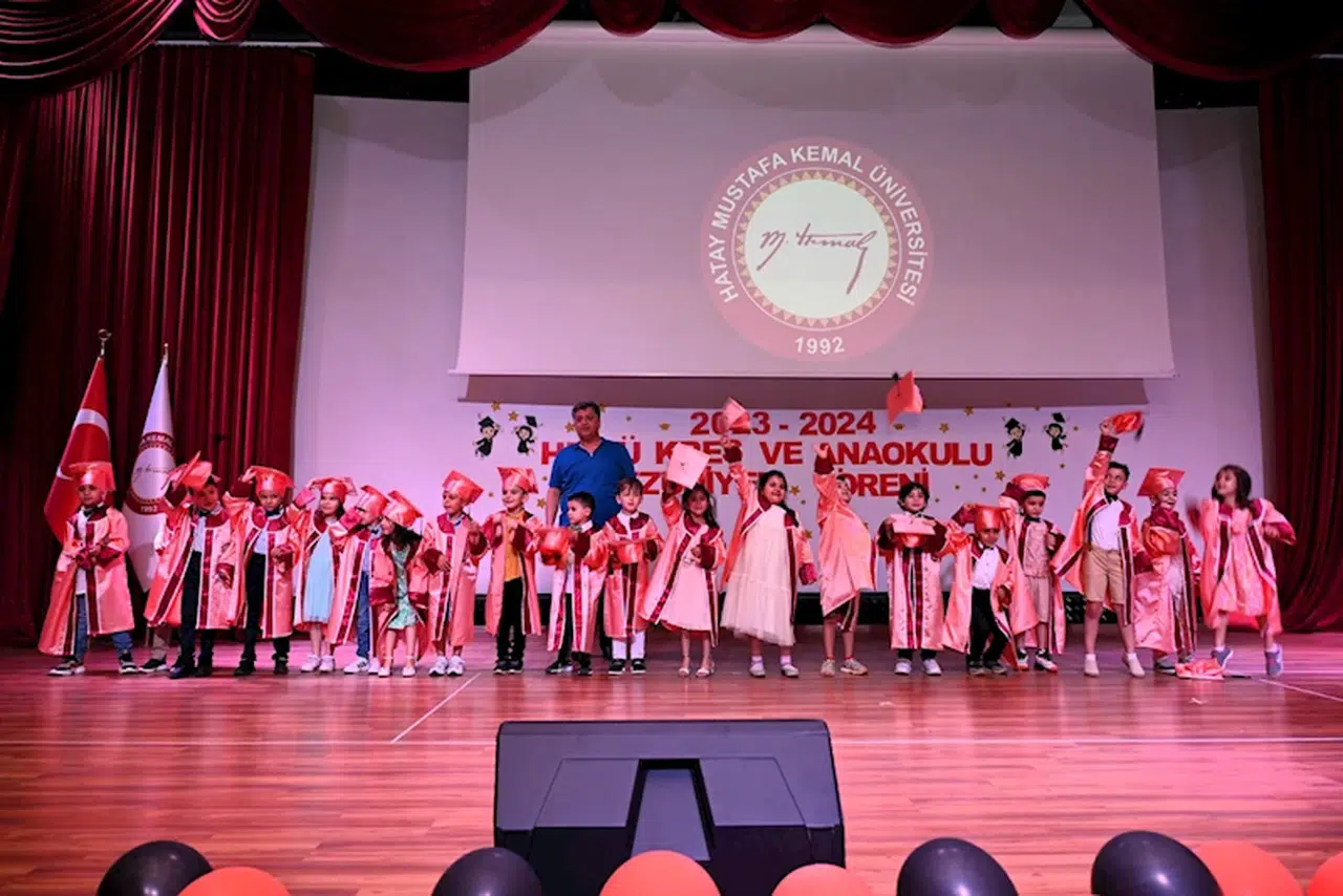 Samim SELÇUK/ HATAY, (DHA) - HATAY Mustafa Kemal Üniversitesi bünyesinde kurulan kreş ve anaokulunda 2023-2024 yılını başarıyla tamamlayan minik öğrenciler, hayatlarının ilk mezuniyetin yaşadı.