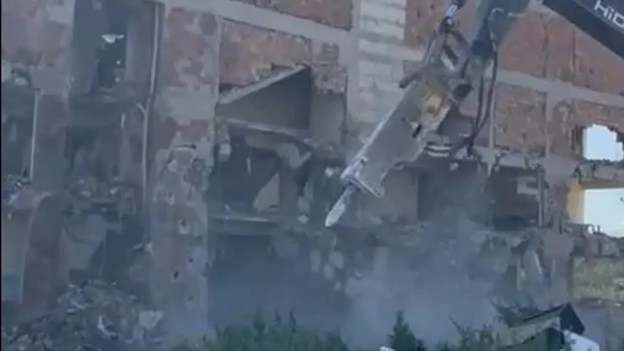 Hatay'da, 6 Şubat depremlerinde zarar gören 6 katlı binanın kontrollü yıkımı başlatıldı. Çekmece Mahallesi'ndeki yıkım, iş makinesiyle gerçekleştirildi ve anları cep telefonu ile kaydedildi. Yıkım sırasında yoğun toz bulutları oluştu.