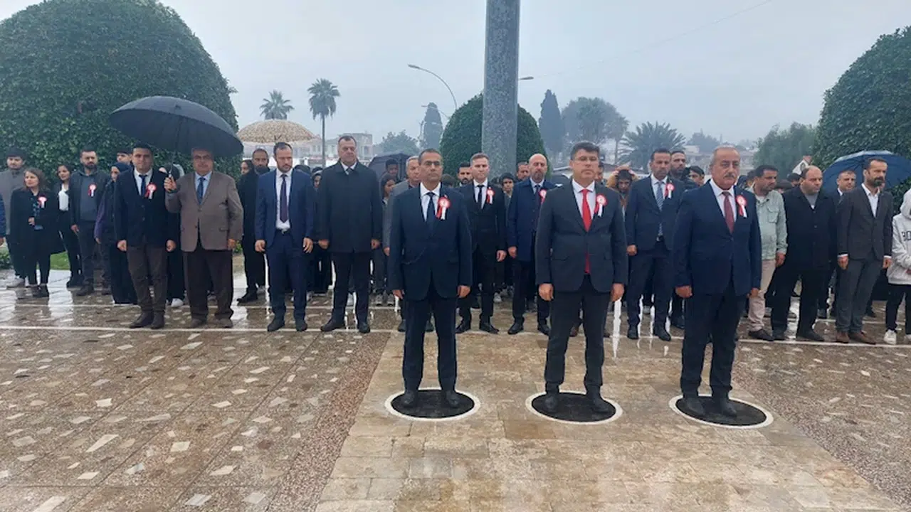 Atatürk Anıtı’nda gerçekleşen çelenk sunma törenine Hatay İl Milli Eğitim Müdürü Dr. Harun Tüysüz, ilçe milli eğitim müdürleri, kurum amirleri ve eğitimciler katıldı. Saygı duruşu ve İstiklal Marşı’nın okunmasının ardından Tüysüz, Atatürk Anıtı'na çelenk sundu. Tören, çelenk sunumuyla sona erdi. (DHA)