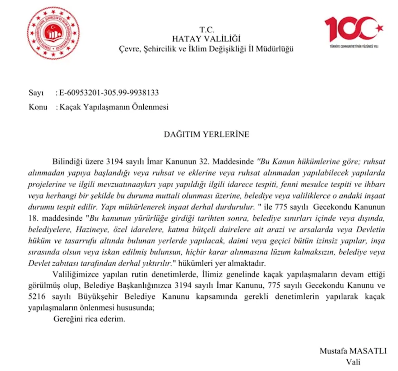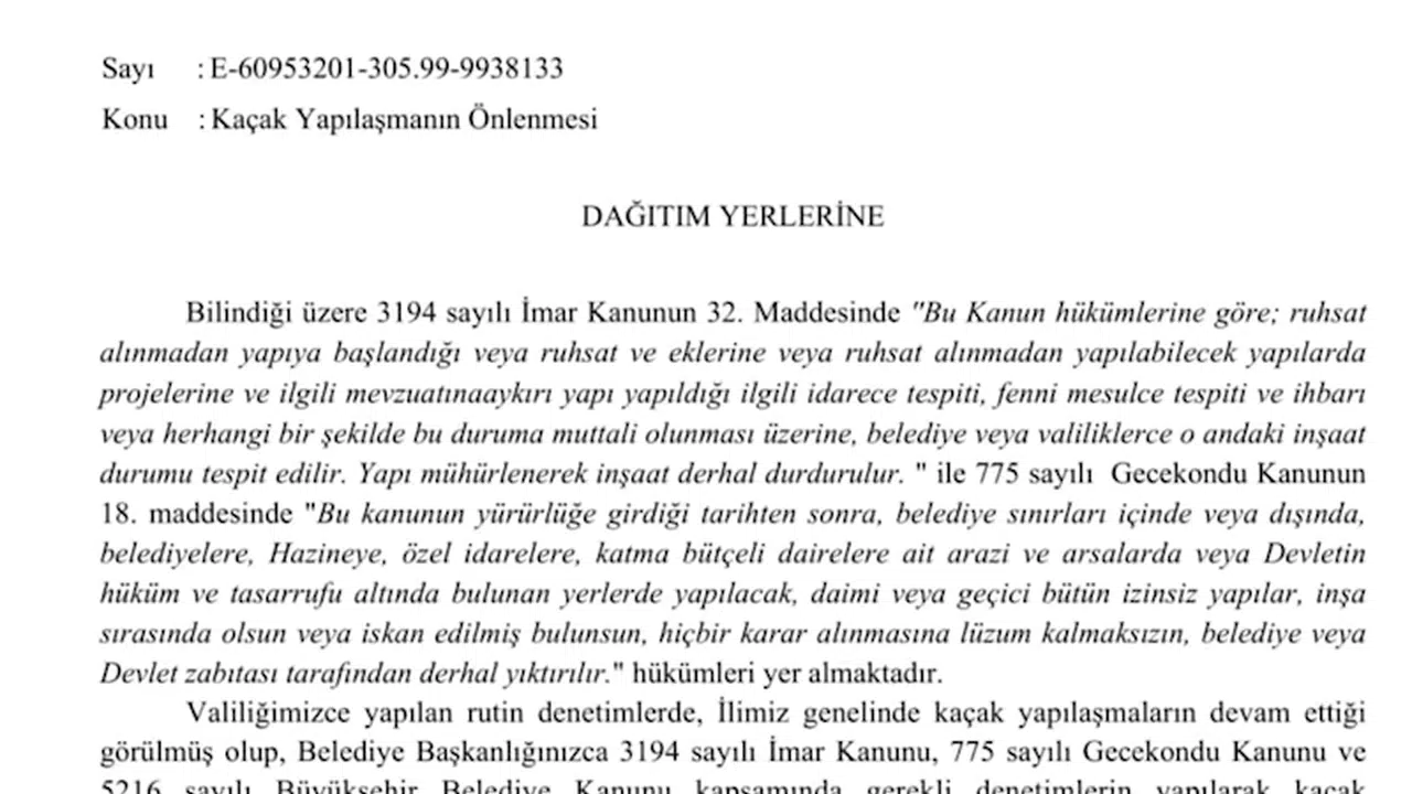 “Bilindiği üzere 3194 sayılı İmar Kanunun 32. Maddesinde ‘Bu Kanun hükümlerine göre; ruhsat alınmadan yapıya başlandığı veya ruhsat ve eklerine veya ruhsat alınmadan yapılabilecek yapılarda projelerine ve ilgili mevzuata aykırı yapı yapıldığı ilgili idarece tespiti, fenni mesulce tespiti ve ihbarı veya herhangi bir şekilde bu duruma muttali olunması üzerine, belediye veya valiliklerce o andaki inşaat durumu tespit edilir. Yapı mühürlenerek inşaat derhal durdurulur.’ ile 775 sayılı Gecekondu Kanunun 18. maddesinde ‘Bu kanunun yürürlüğe girdiği tarihten sonra, belediye sınırları içinde veya dışında, belediyelere, Hazineye, özel idarelere, katma bütçeli dairelere ait arazi ve arsalarda veya Devletin hüküm ve tasarrufu altında bulunan yerlerde yapılacak, daimi veya geçici bütün izinsiz yapılar, inşa sırasında olsun veya iskan edilmiş bulunsun, hiçbir karar alınmasına lüzum kalmaksızın, belediye veya Devlet zabıtası tarafından derhal yıktırılır.’ hükümleri yer almaktadır. Valiliğimizce yapılan rutin denetimlerde, ilimiz genelinde kaçak yapılaşmaların devam ettiği görülmüş olup, Belediye Başkanlığımızca 3194 sayılı İmar Kanunu, 775 sayılı Gecekondu Kanunu ve 5216 sayılı Büyükşehir Belediye Kanunu kapsamında gerekli denetimlerin yapılarak kaçak yapılaşmaların önlenmesi hususunda; Gereğini rica ederim.”(DHA)