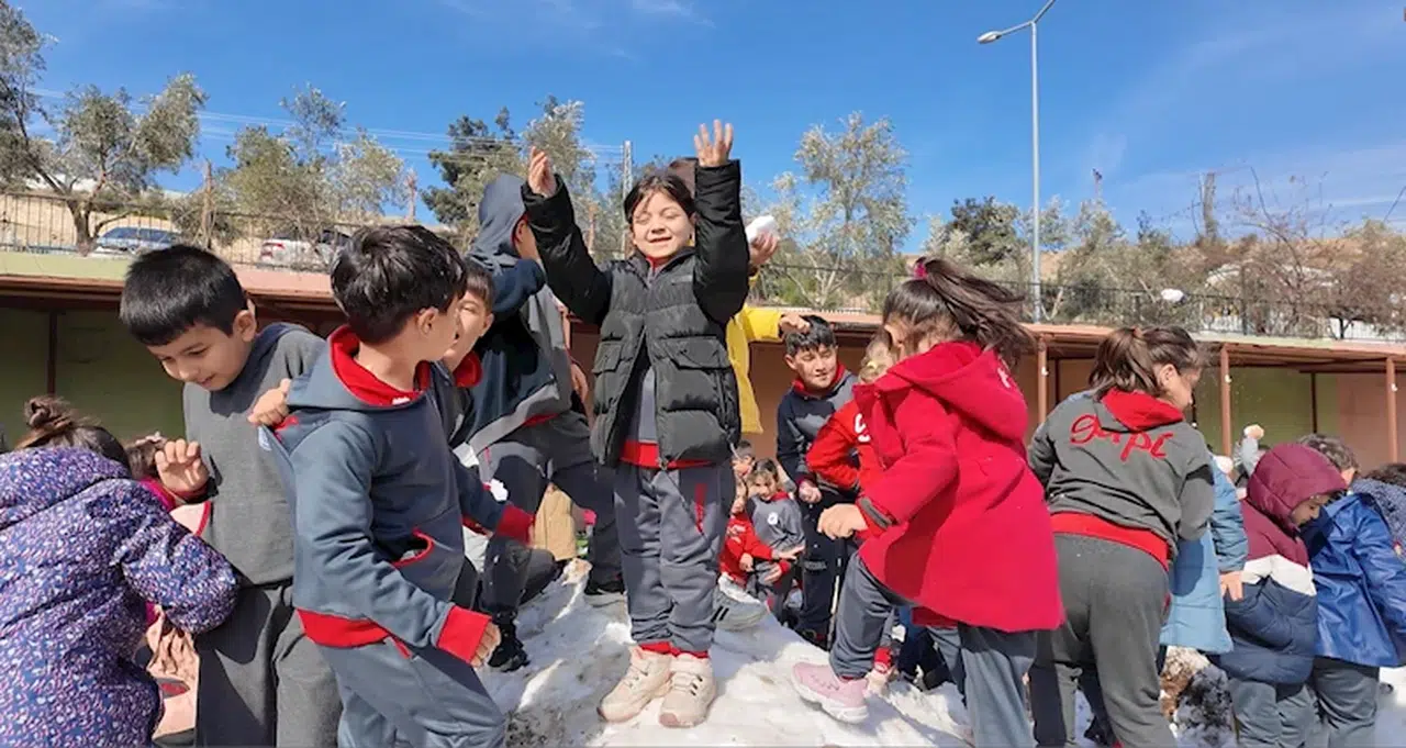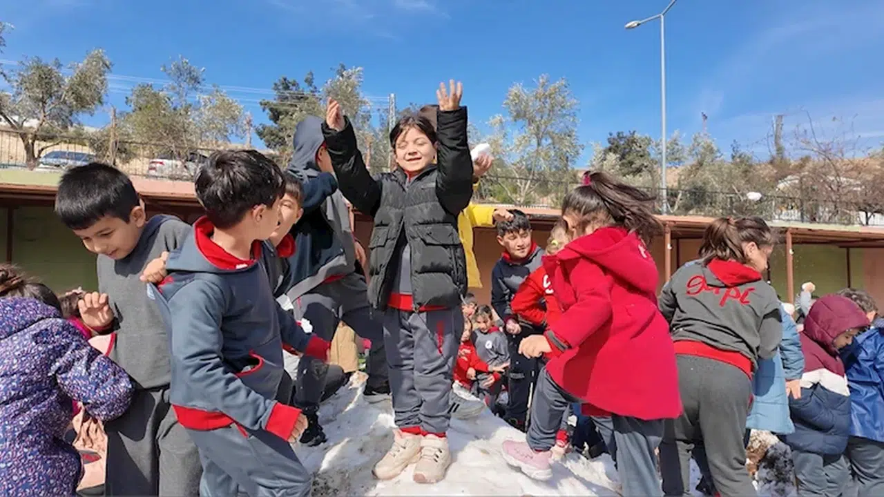 Hatay’da öğrencilerin isteği üzerine okul bahçesine kar getirildi