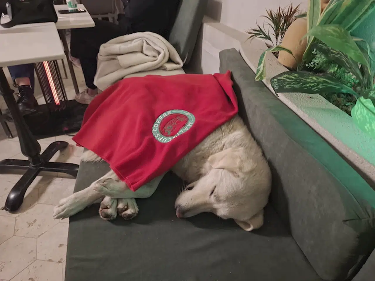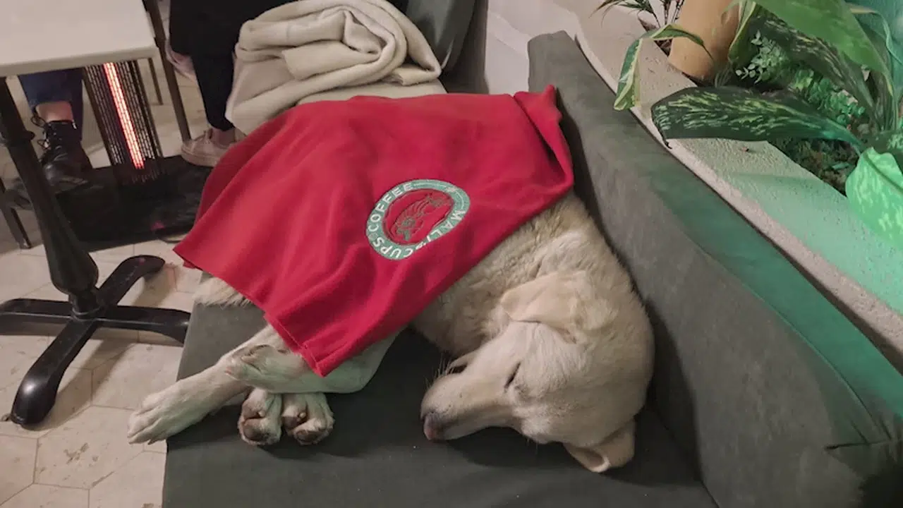 İlçeye bağlı Deniz Mahalle'sinde kahve ürünleri satan bir kafenin çalışanları, akşam saatlerinde iş yerinin önünde yağmur altında üşüyen bir köpek gördü. Kafe çalışanları, bitkin haldeki köpeği içeriye alıp, yiyecek verdi. Köpek, kafenin içinde bulunan koltuk üzerinde yatarak ısındı. (DHA)