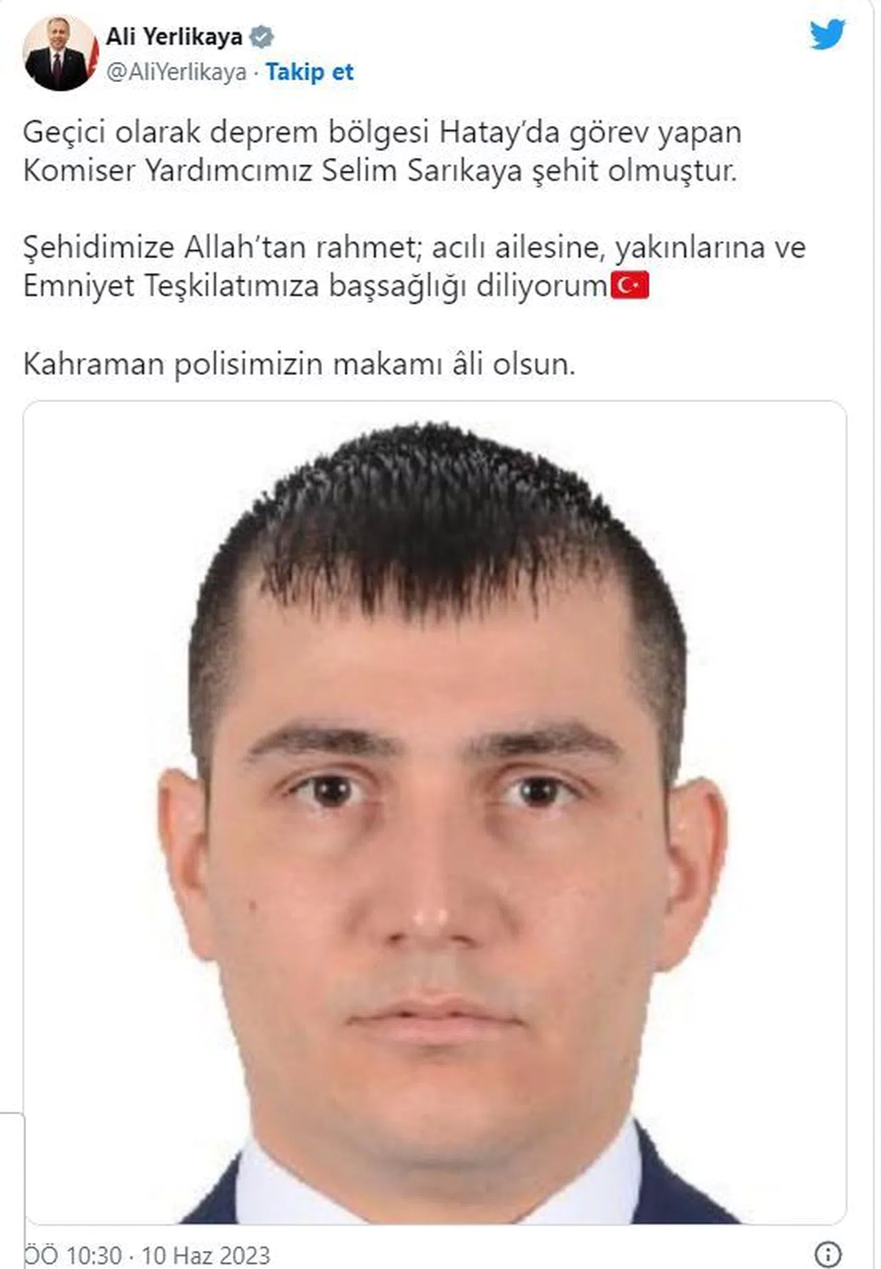 İçişleri Bakanı Ali Yerlikaya, geçici olarak deprem bölgesi Hatay'da görev yapan Komiser Yardımcısı Selim Sarıkaya'nın şehit olduğunu duyurdu.