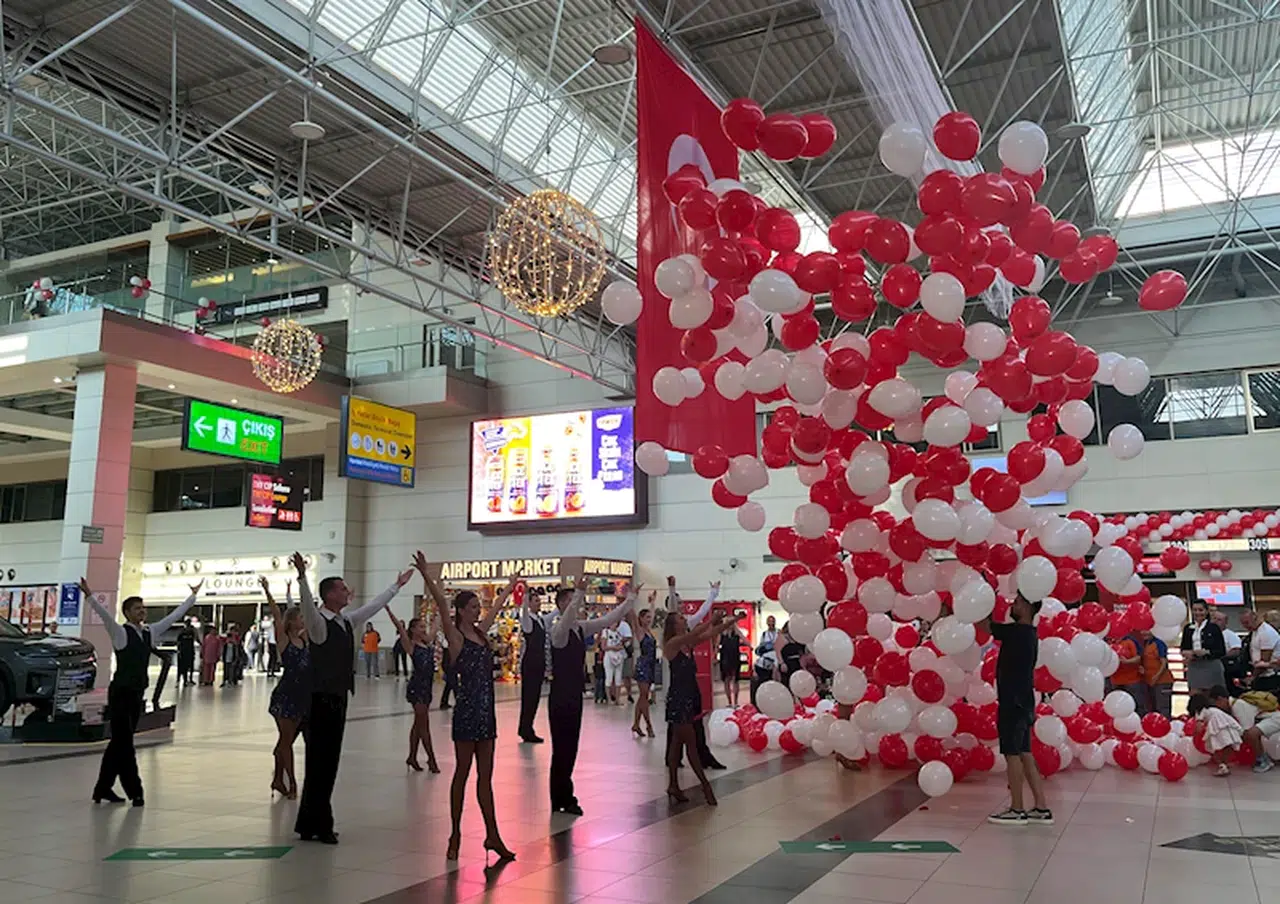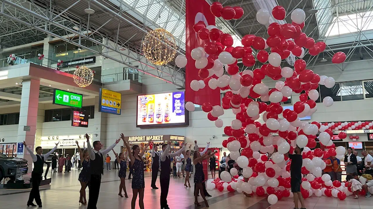 Tüm terminal, kırmızı beyaz balonlar, Türk bayrakları ve Atatürk posterleri ile süslenerek bayramın ruhunu yansıttı. Etkinlikler kapsamında vals dans gösterileri ve geleneksel Zeybek grubu performansları sergilendi. Yolcular ve havalimanı personeli, bu özel günün anlam ve önemine uygun düzenlenen etkinliklere büyük ilgi gösterdi. 30 Ağustos Zafer Bayramı'nın coşkusu, havalimanının her köşesinde hissedildi.