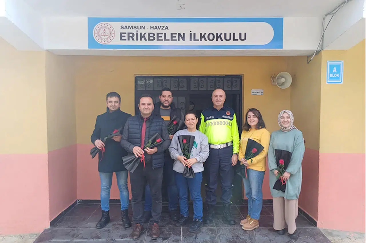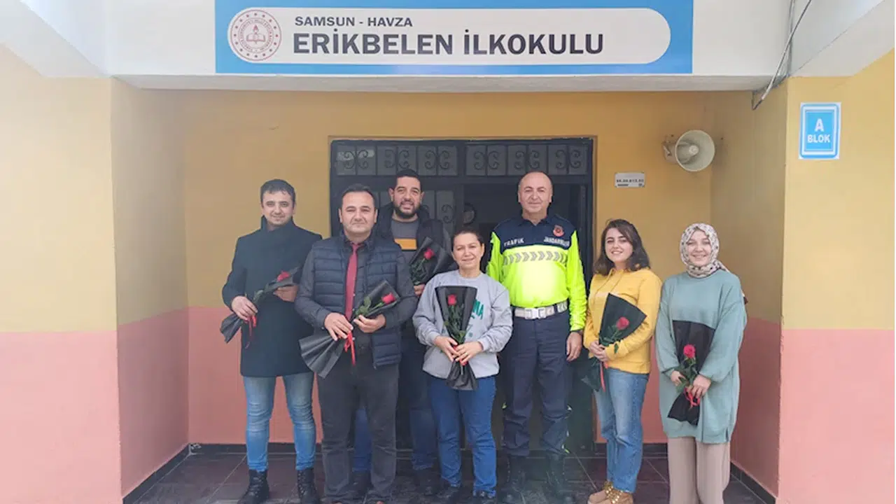 Havza Jandarma trafik ekibi, Erikbelen İlkokulu'nu ziyaret ederek, burada görev yapan öğretmenlerin Öğretmen Günü'nü kutladı ve çiçek sundu.