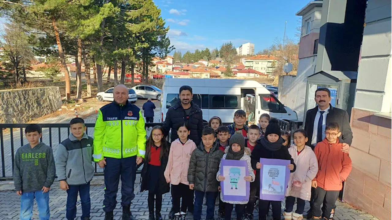 Ziyarette öğrenciler uzman jandarmalara Atatürk panosu ile kendi yaptıkları resimleri hediye etti.