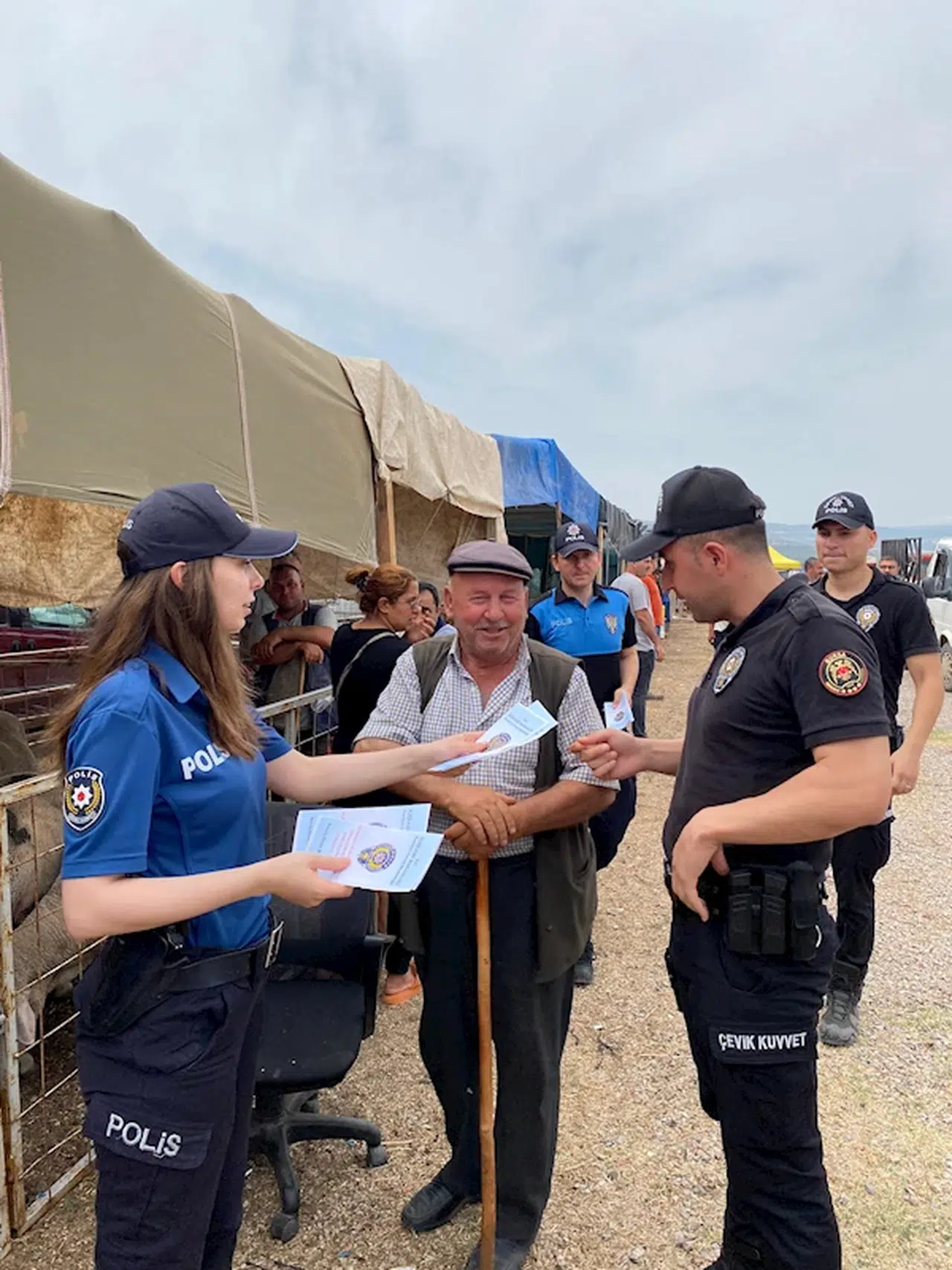 İlçe Emniyet Müdürlüğü Asayiş Büro Amirliği ekipleri, Kurban Bayramı öncesi hayvan satışı yapılan pazara giderek esnafla buluştu. Polisler, satışa çıkardıkları hayvanlarını pazarlarken dolandırılmamaları için esnafı uyardı. Hırsızlık, sahte para ve tırnakçılık yöntemiyle dolandırıcılık konularında uyarılarda bulunan ekipler, esnafa Türk Lirasının güvenlik özelliklerinin yer aldığı broşürleri de dağıttı. Hayvan satıcılarına bir banknotun sahte olup olmadığının nasıl anlaşılacağıyla ilgili de bilgi verildi. Satıcılardan olumsuz bir durumla karşılaşmaları halinde 112 Acil Çağrı Merkezine ihbarda bulunmaları istendi. (DHA)