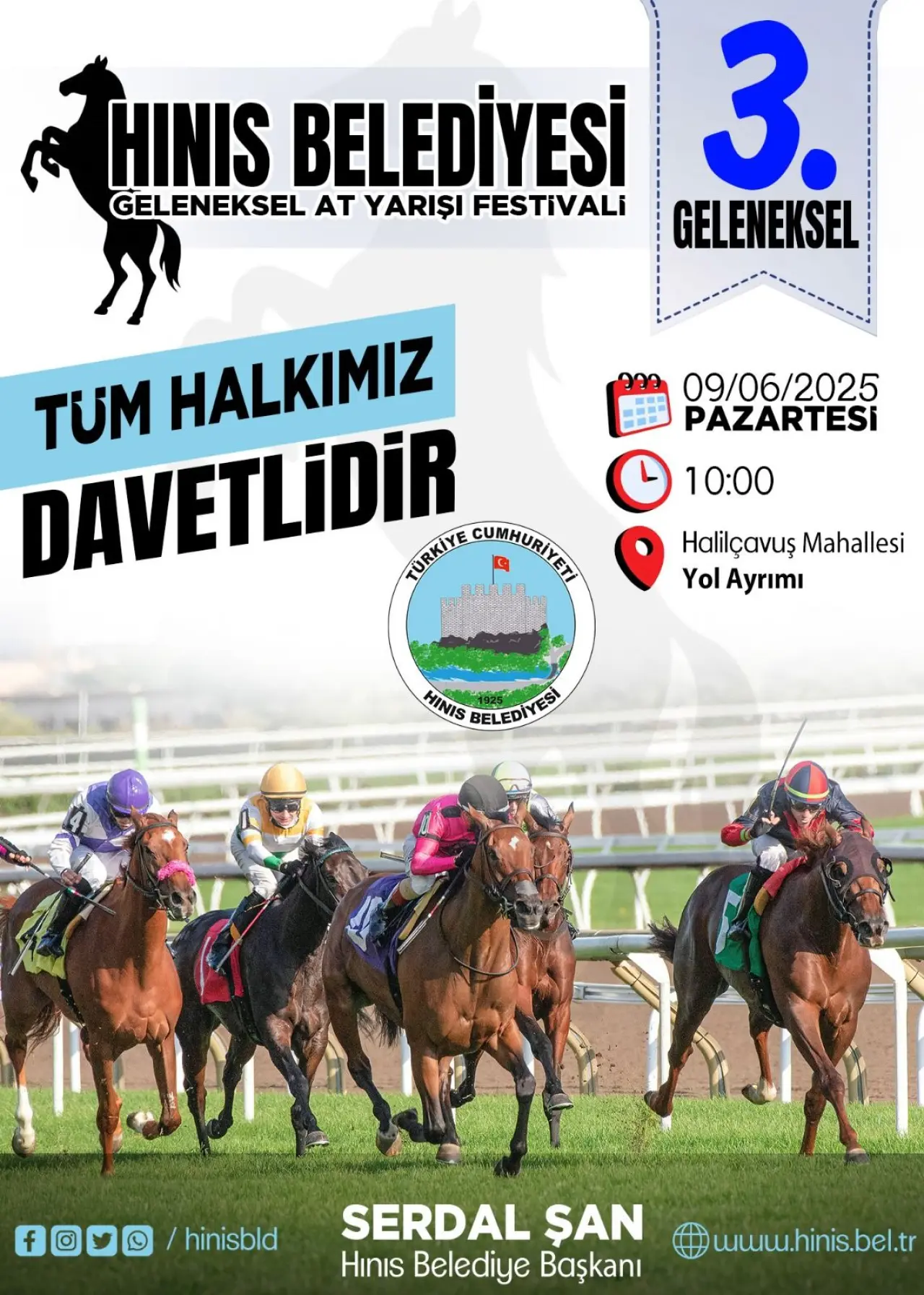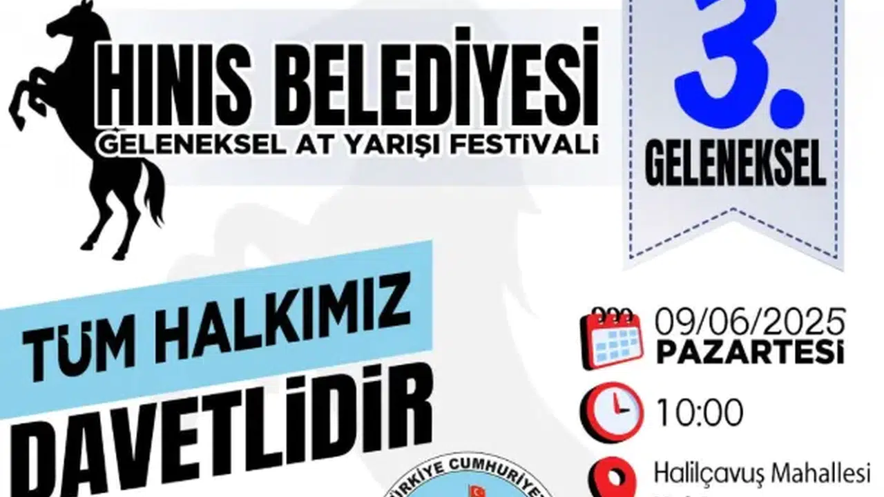 Hınıs Belediyesi tarafından organize edilen 3. Geleneksel At Yarışı Festivali, 9 Haziran 2025 Pazartesi günü Haliçavuş Mahallesi Yol Ayrımı’nda gerçekleştirilecek. Saat 10:00’da başlayacak olan etkinlik, hemşehrileri bir araya getirerek birlik, beraberlik ve heyecan dolu anlar yaşatacak.