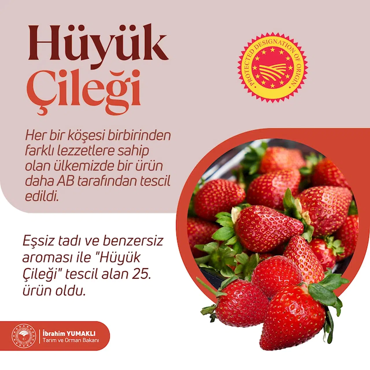 Açıklamada görüşlerine yer verilen Tarım ve Orman Bakanı İbrahim Yumaklı, tarıma büyük destekler verdiklerine işaret ederek, Konya'nın AB tescilli ilk ürünü olan Hüyük çileğinin tescil almasında emeği geçenlere teşekkür etti. Ülke lezzetlerinin son dönemde art arda AB tescili aldığını belirten Yumaklı, tescil için ilanda bekleyen ürün sayının 5 ve başvuruda bekleyen ürün sayısının 57 olduğunu kaydetti. Türkiye'nin tarım ürünleri konusunda zengin bir potansiyele, dünyada seçkin bir yere sahip olduğuna dikkat çeken Yumaklı, ülkenin bu zenginliğinin korunması ve daha da geliştirilmesi için çalışmalar yürüttüklerini vurguladı.