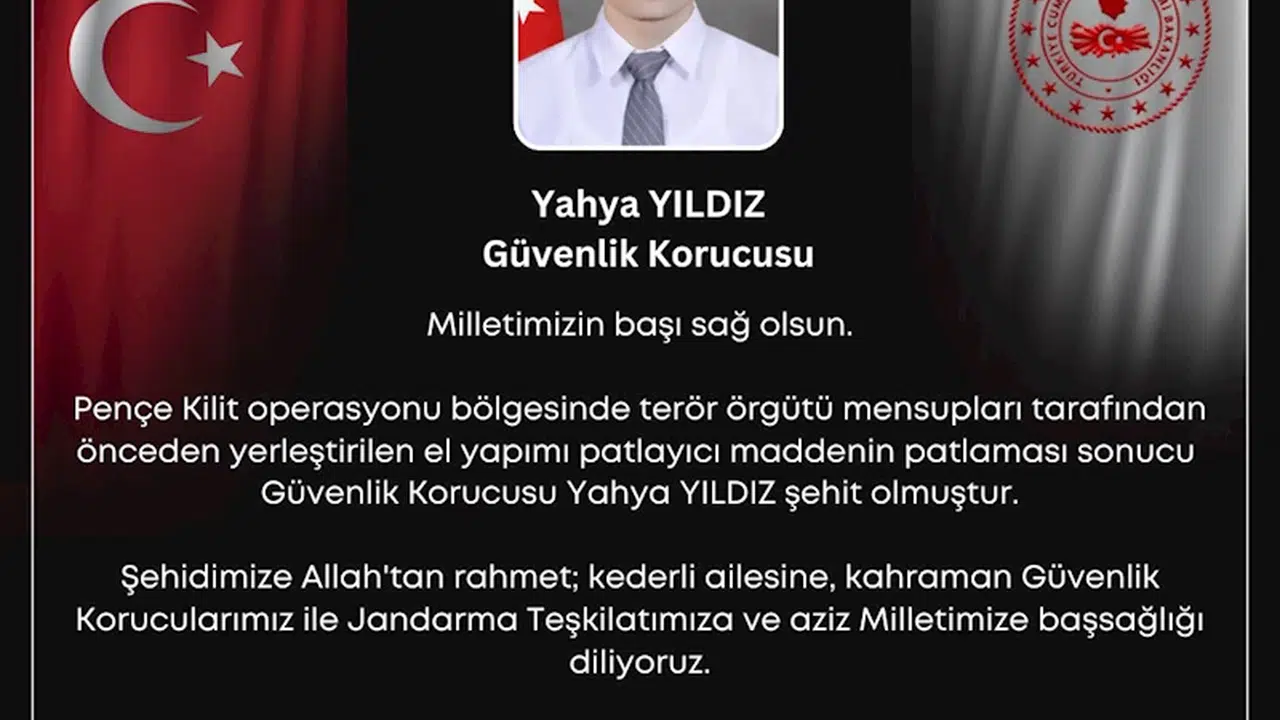 Bakanlığın sosyal medya hesabından yapılan açıklamada, "Pençe Kilit operasyonu bölgesinde terör örgütü mensupları tarafından önceden yerleştirilen el yapımı patlayıcı maddenin patlaması sonucu Güvenlik Korucusu Yahya Yıldız şehit olmuştur. Şehidimize Allah'tan rahmet; kederli ailesine, kahraman güvenlik korucularımız ile jandarma teşkilatımıza ve aziz milletimize başsağlığı diliyoruz" denildi. (DHA)