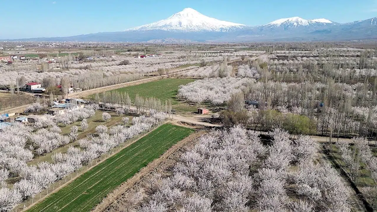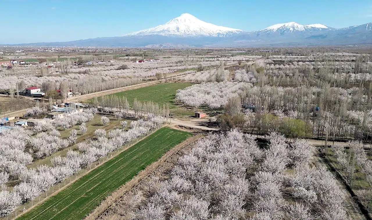 Yıllık 50 bin ton kayısı üretimi ile Türkiye'nin önemli merkezlerinden Iğdır'da, ilkbaharın gelişiyle güzel görüntüler oluştu. Deniz seviyesinden 5 bin 176 metre yüksekliği ile 'Türkiye'nin çatısı' olarak nitelendirilen ve yılın 12 ayı zirvesi buzullarla kaplı olan Ağrı Dağı'nın eteklerindeki Iğdır Ovası, açan kayısı çiçekleri ile beyaza büründü. Kent ekonomisinde önemli yere sahip kayısının yetiştirildiği bahçelerdeki 350 bin civarındaki ağaçta açan çiçekler görsel şölen sunarken, özellikle fotoğrafçılar ile doğaseverler çektikleri kareleri sosyal medyadan paylaşıyor. (DHA)