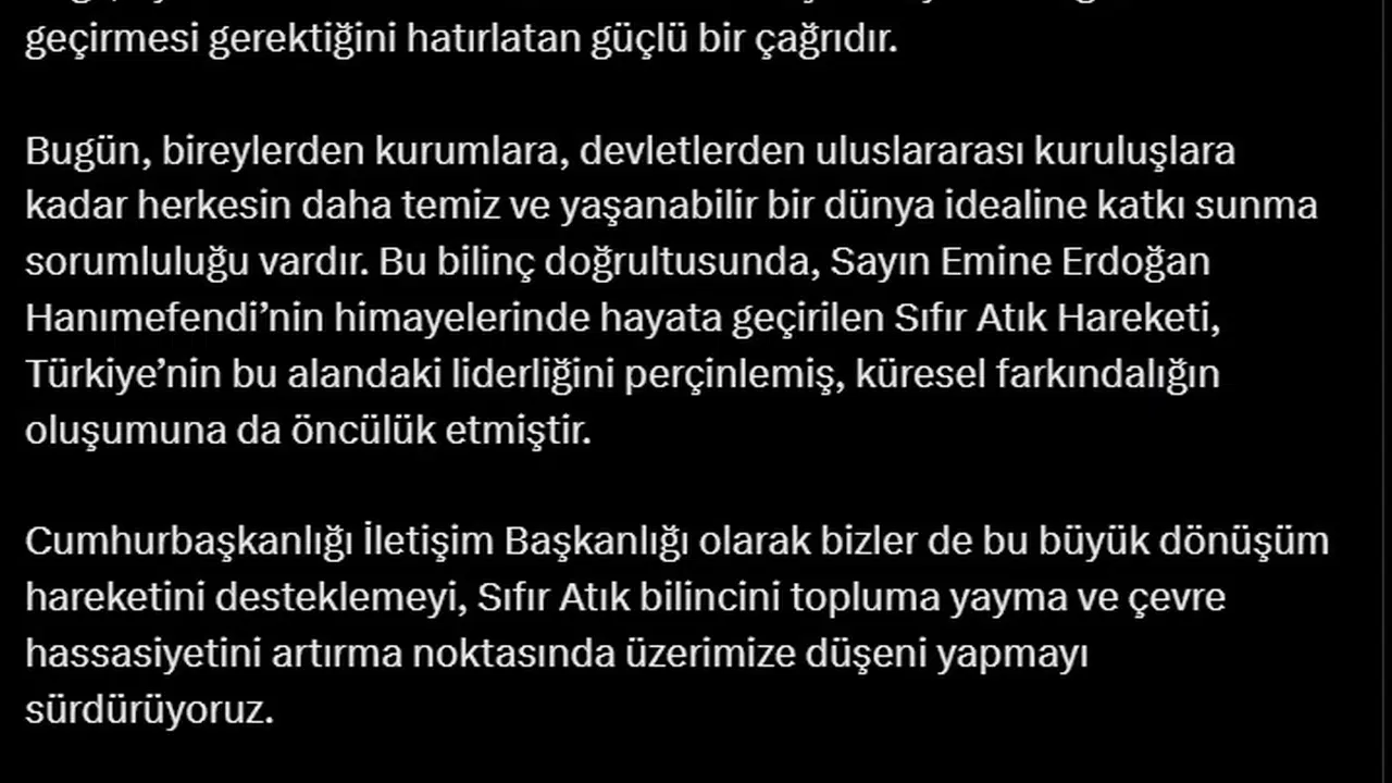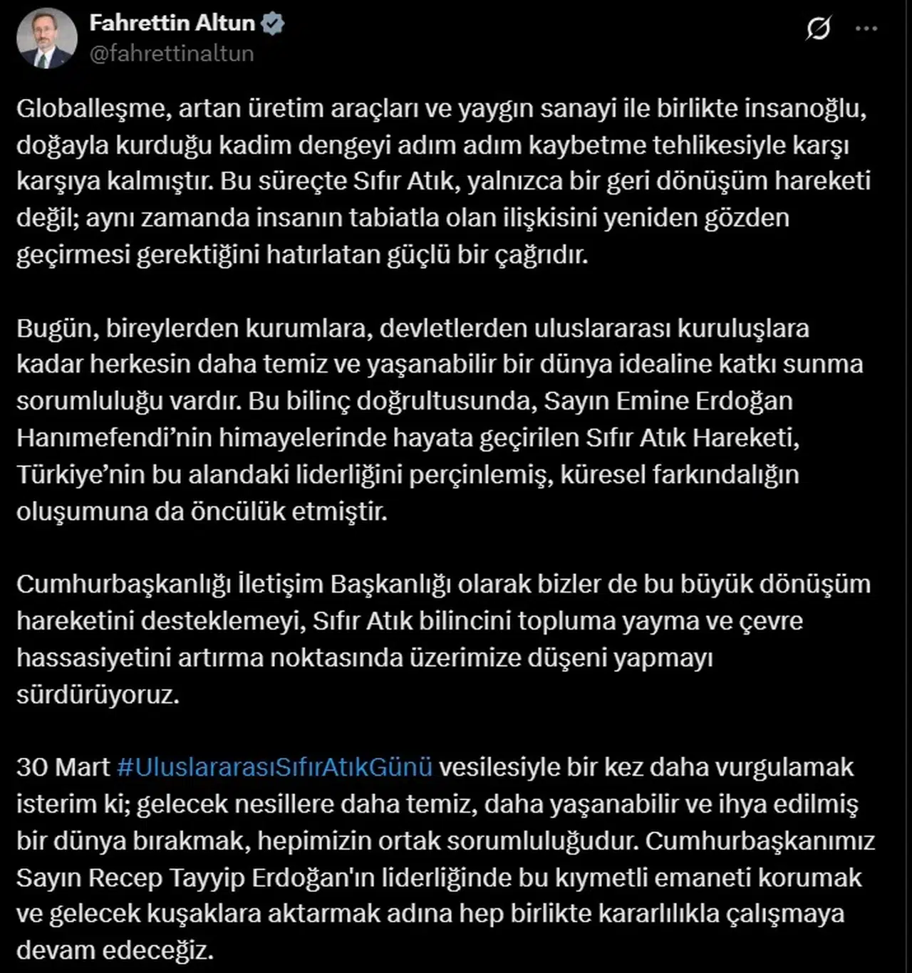 Kübra SONKAYA/ANKARA, (DHA)- İLETİŞİM Başkanı Fahrettin Altun, "30 Mart Uluslararası Sıfır Atık Günü vesilesiyle bir kez daha vurgulamak isterim ki gelecek nesillere daha temiz, daha yaşanabilir ve ihya edilmiş bir dünya bırakmak, hepimizin ortak sorumluluğudur" dedi.