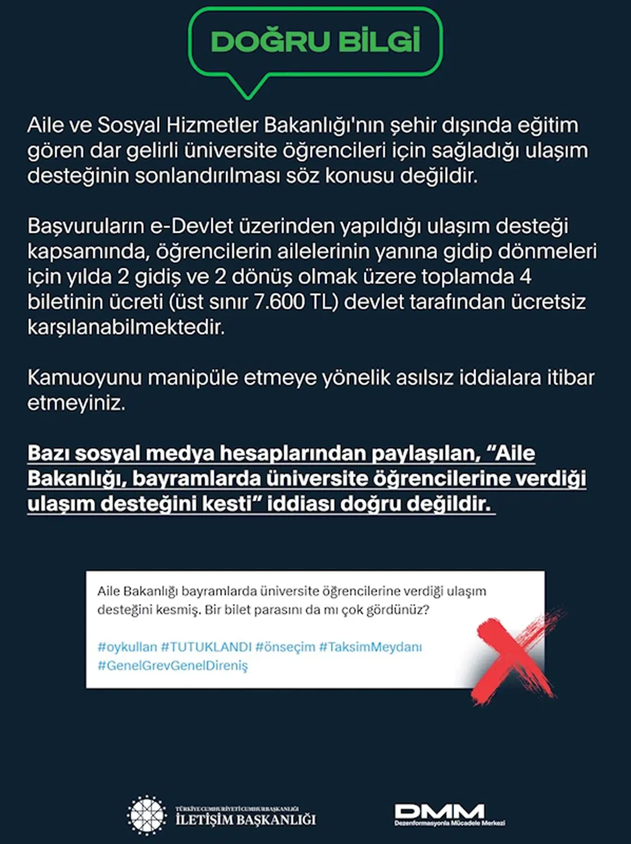 ANKARA, (DHA)- CUMHURBAŞKANLIĞI İletişim Başkanlığı Dezenformasyonla Mücadele Merkezi (DMM), "Bazı sosyal medya hesaplarından paylaşılan, 'Aile Bakanlığı, bayramlarda üniversite öğrencilerine verdiği ulaşım desteğini kesti' iddiası doğru değildir" açıklamasında bulundu.