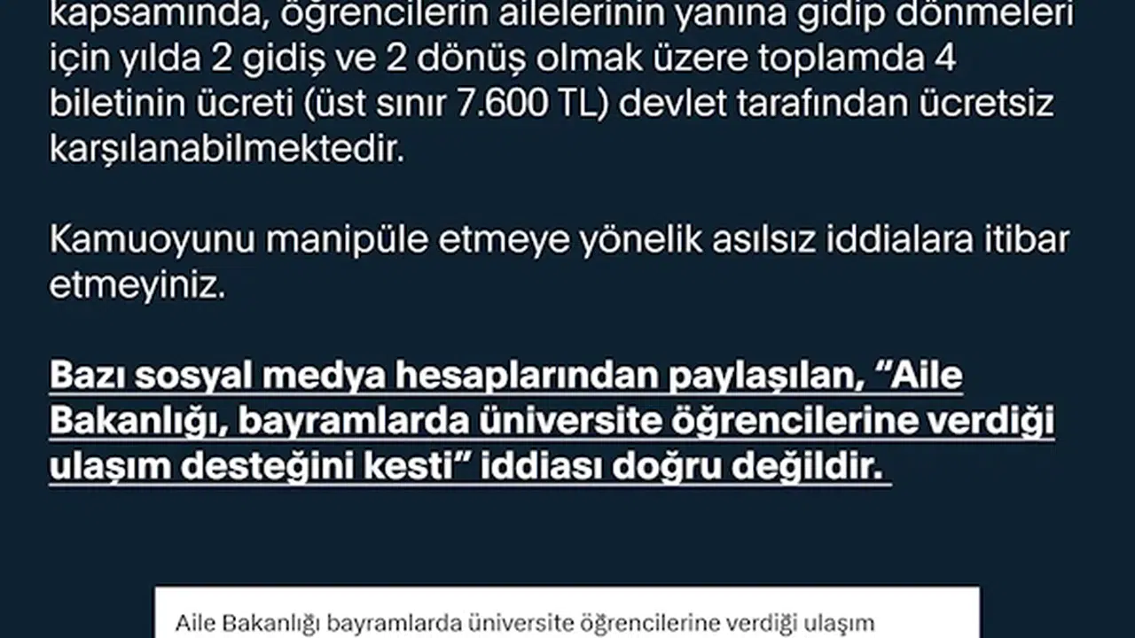 DMM'nin sosyal medya hesabından yapılan açıklamada, "Bazı sosyal medya hesaplarından paylaşılan, 'Aile Bakanlığı, bayramlarda üniversite öğrencilerine verdiği ulaşım desteğini kesti' iddiası doğru değildir. Aile ve Sosyal Hizmetler Bakanlığı'nın şehir dışında eğitim gören dar gelirli üniversite öğrencileri için sağladığı ulaşım desteğinin sonlandırılması söz konusu değildir. Başvuruların e-Devlet üzerinden yapıldığı ulaşım desteği kapsamında, öğrencilerin ailelerinin yanına gidip dönmeleri için yılda 2 gidiş ve 2 dönüş olmak üzere toplamda 4 biletinin ücreti (üst sınır 7.600 TL) devlet tarafından ücretsiz karşılanabilmektedir. Kamuoyunu manipüle etmeye yönelik asılsız iddialara itibar etmeyiniz" denildi. (DHA)