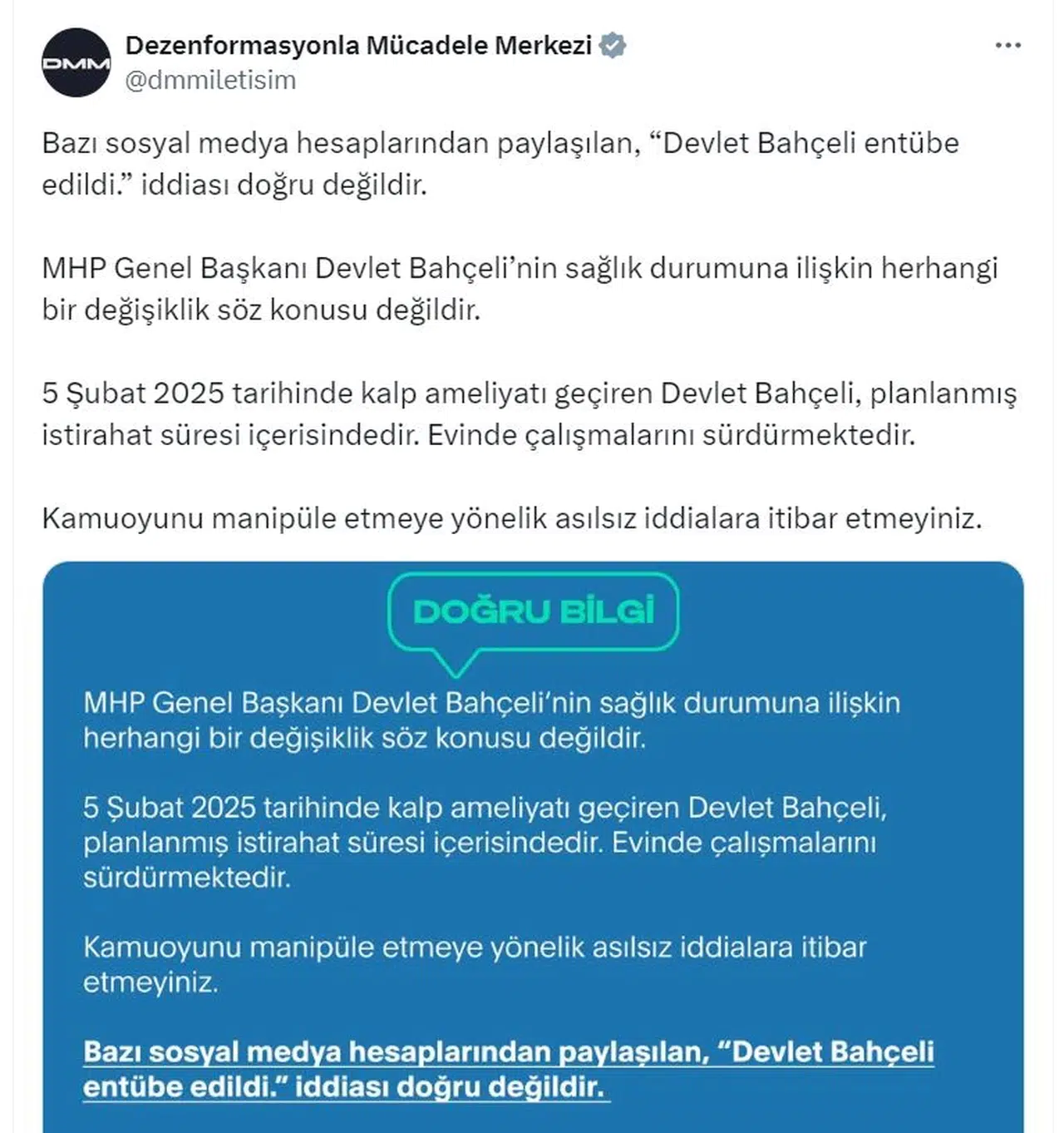 DMM'nin sosyal medya hesabından yapılan açıklamada, "Bazı sosyal medya hesaplarından paylaşılan, 'Devlet Bahçeli entübe edildi' iddiası doğru değildir. MHP Genel Başkanı Devlet Bahçeli’nin sağlık durumuna ilişkin herhangi bir değişiklik söz konusu değildir. 5 Şubat 2025 tarihinde kalp ameliyatı geçiren Devlet Bahçeli, planlanmış istirahat süresi içerisindedir. Evinde çalışmalarını sürdürmektedir. Kamuoyunu manipüle etmeye yönelik asılsız iddialara itibar etmeyiniz" denildi. (DHA)