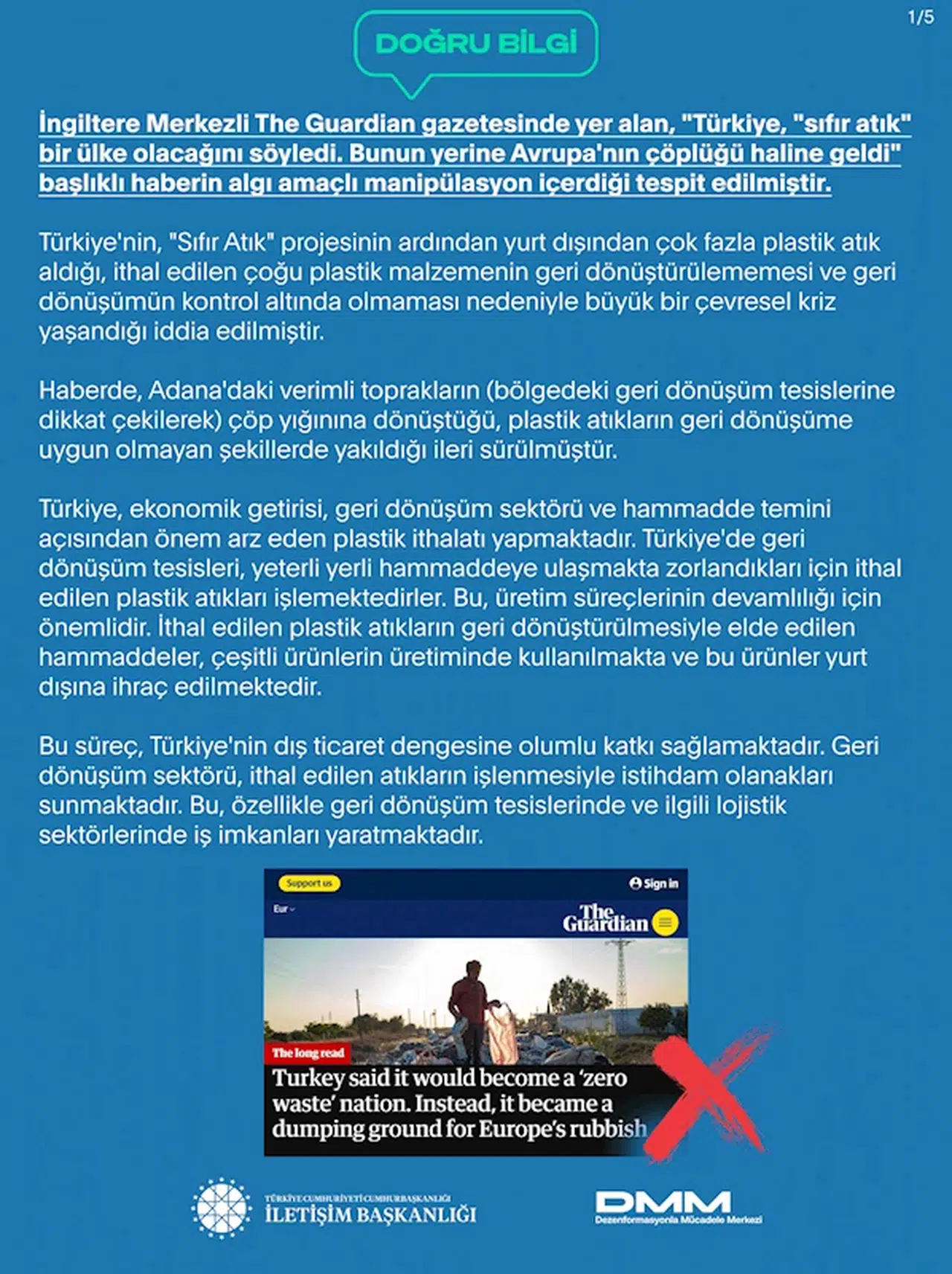 DMM'nin sosyal medya hesabından yapılan açıklamada, "İngiltere merkezli The Guardian gazetesinde yer alan, 'Türkiye, 'sıfır atık' bir ülke olacağını söyledi. Bunun yerine Avrupa'nın çöplüğü haline geldi' başlıklı haberin algı amaçlı manipülasyon içerdiği tespit edilmiştir. Türkiye'nin, 'Sıfır Atık' projesinin ardından yurt dışından çok fazla plastik atık aldığı, ithal edilen çoğu plastik malzemenin geri dönüştürülememesi ve geri dönüşümün kontrol altında olmaması nedeniyle büyük bir çevresel kriz yaşandığı iddia edilmiştir. Türkiye'nin geri dönüştürülebilir atıklarla ilgili mevzuatı ve Sıfır Atık Hareketi'nin kazanımları ile uluslararası alandaki ödülleri, bahse konu haberdeki kasıtlı manipülasyon ve propagandayı ortaya koymaktadır" denildi.