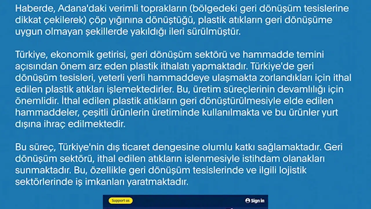 Söz konusu haberde, Adana'daki verimli toprakların çöp yığınına dönüştüğü, plastik atıkların geri dönüşüme uygun olmayan şekillerde yakıldığının ileri sürüldüğü kaydedilerek, "Türkiye, ekonomik getirisi, geri dönüşüm sektörü ve ham madde temini açısından önem arz eden plastik ithalatı yapmaktadır. Türkiye'de geri dönüşüm tesisleri, yeterli yerli ham maddeye ulaşmakta zorlandıkları için ithal edilen plastik atıkları işlemektedirler. Bu, üretim süreçlerinin devamlılığı için önemlidir. İthal edilen plastik atıkların geri dönüştürülmesiyle elde edilen ham maddeler, çeşitli ürünlerin üretiminde kullanılmakta ve bu ürünler yurt dışına ihraç edilmektedir. Bu süreç, Türkiye'nin dış ticaret dengesine olumlu katkı sağlamaktadır. Geri dönüşüm sektörü, ithal edilen atıkların işlenmesiyle istihdam olanakları sunmaktadır. Bu, özellikle geri dönüşüm tesislerinde ve ilgili lojistik sektörlerinde iş imkanları yaratmaktadır" ifadelerine yer verildi.