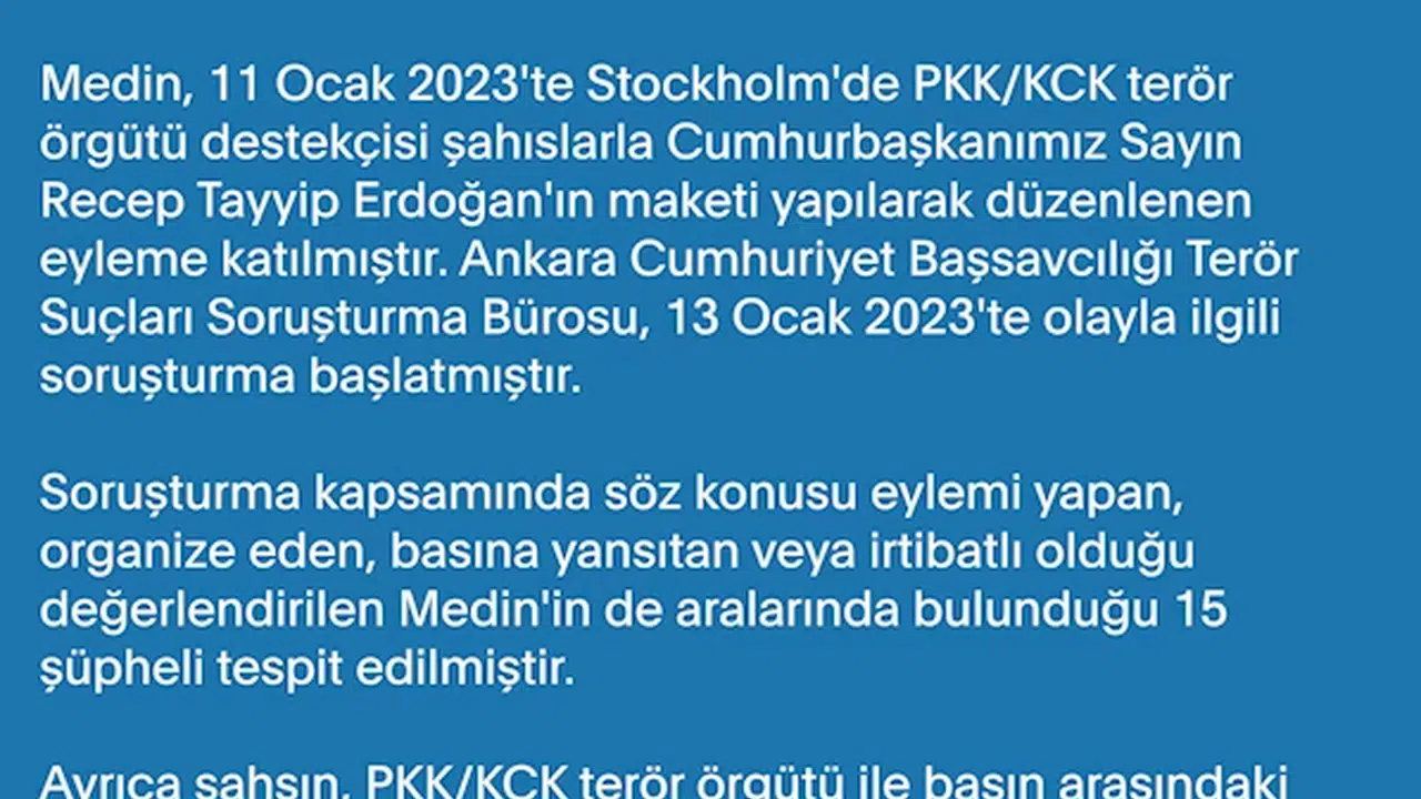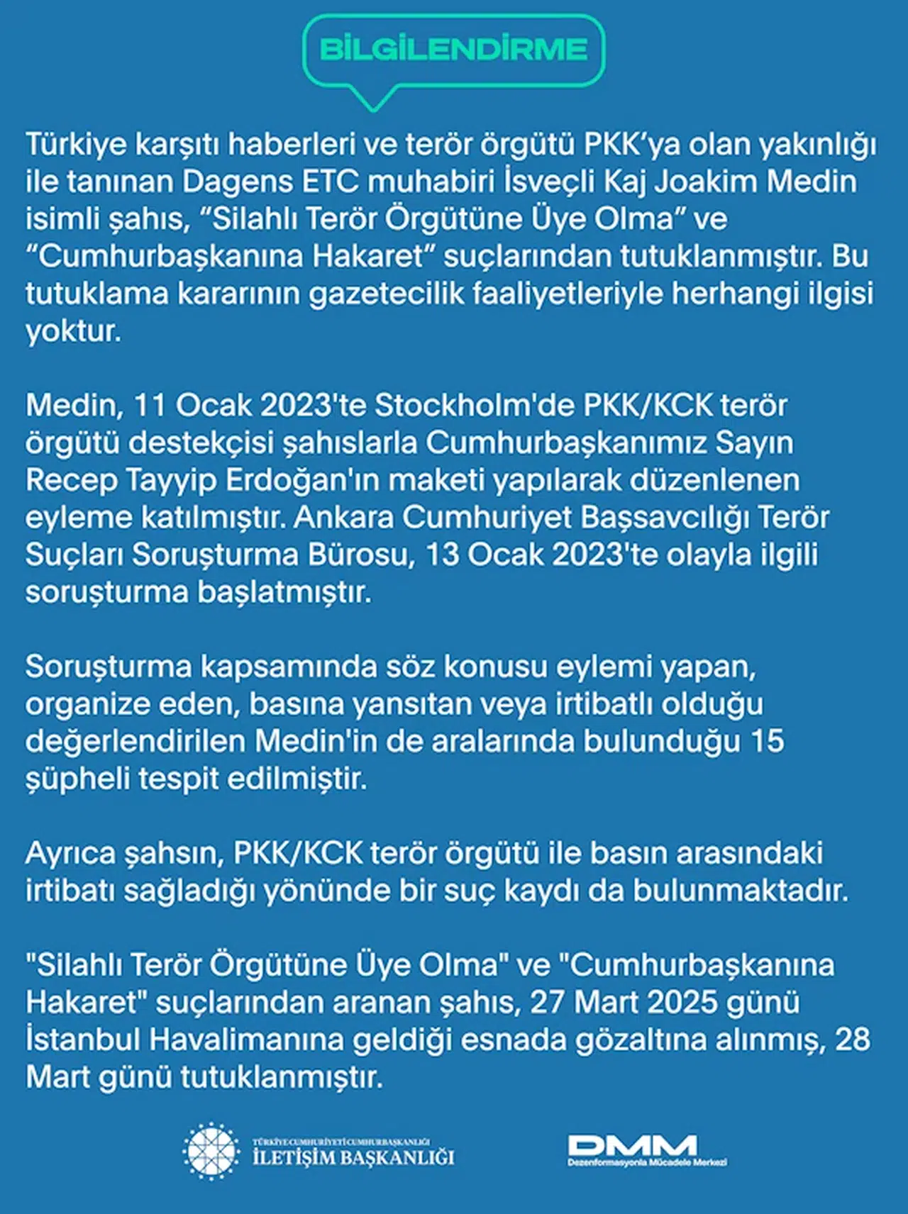 DMM’nin sosyal medya hesabından yapılan açıklamada, “Türkiye karşıtı haberleri ve terör örgütü PKK’ya olan yakınlığı ile tanınan Dagens ETC muhabiri İsveçli Kaj Joakim Medin isimli şahıs, ‘Silahlı Terör Örgütüne Üye Olma’ ve ‘Cumhurbaşkanına Hakaret’ suçlarından tutuklanmıştır. Bu tutuklama kararının gazetecilik faaliyetleriyle herhangi bir ilgisi yoktur. Medin, 11 Ocak 2023'te Stockholm'de PKK/KCK terör örgütü destekçisi şahıslarla Cumhurbaşkanımız Sayın Recep Tayyip Erdoğan'ın maketi yapılarak düzenlenen eyleme katılmıştır. Ankara Cumhuriyet Başsavcılığı Terör Suçları Soruşturma Bürosu, 13 Ocak 2023'te olayla ilgili soruşturma başlatmıştır. Soruşturma kapsamında söz konusu eylemi yapan, organize eden, basına yansıtan veya irtibatlı olduğu değerlendirilen Medin'in de aralarında bulunduğu 15 şüpheli tespit edilmiştir. Ayrıca şahsın, PKK/KCK terör örgütü ile basın arasındaki irtibatı sağladığı yönünde bir suç kaydı da bulunmaktadır. ‘Silahlı Terör Örgütüne Üye Olma’ ve ‘Cumhurbaşkanına Hakaret’ suçlarından aranan şahıs, 27 Mart 2025 günü İstanbul Havalimanına geldiği esnada gözaltına alınmış, 28 Mart günü tutuklanmıştır” denildi. (DHA)