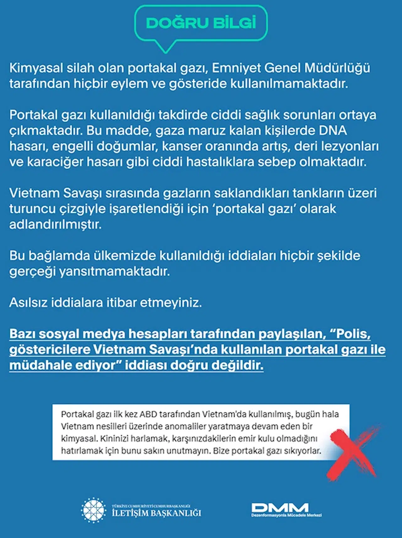 DMM'nin sosyal medya hesabından yapılan açıklamada, "Bazı sosyal medya hesapları tarafından paylaşılan, 'Polis, göstericilere Vietnam Savaşı’nda kullanılan portakal gazı ile müdahale ediyor' iddiası doğru değildir. Kimyasal silah olan portakal gazı, Emniyet Genel Müdürlüğü tarafından hiçbir eylem ve gösteride kullanılmamaktadır. Portakal gazı kullanıldığı takdirde ciddi sağlık sorunları ortaya çıkmaktadır. Bu madde, gaza maruz kalan kişilerde DNA hasarı, engelli doğumlar, kanser oranında artış, deri lezyonları ve karaciğer hasarı gibi ciddi hastalıklara sebep olmaktadır. Vietnam Savaşı sırasında gazların saklandıkları tankların üzeri turuncu çizgiyle işaretlendiği için ‘portakal gazı’ olarak adlandırılmıştır. Bu bağlamda ülkemizde kullanıldığı iddiaları hiçbir şekilde gerçeği yansıtmamaktadır. Asılsız iddialara itibar etmeyiniz" ifadelerine yer verildi. (DHA)