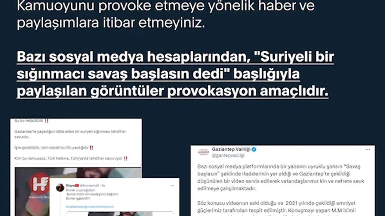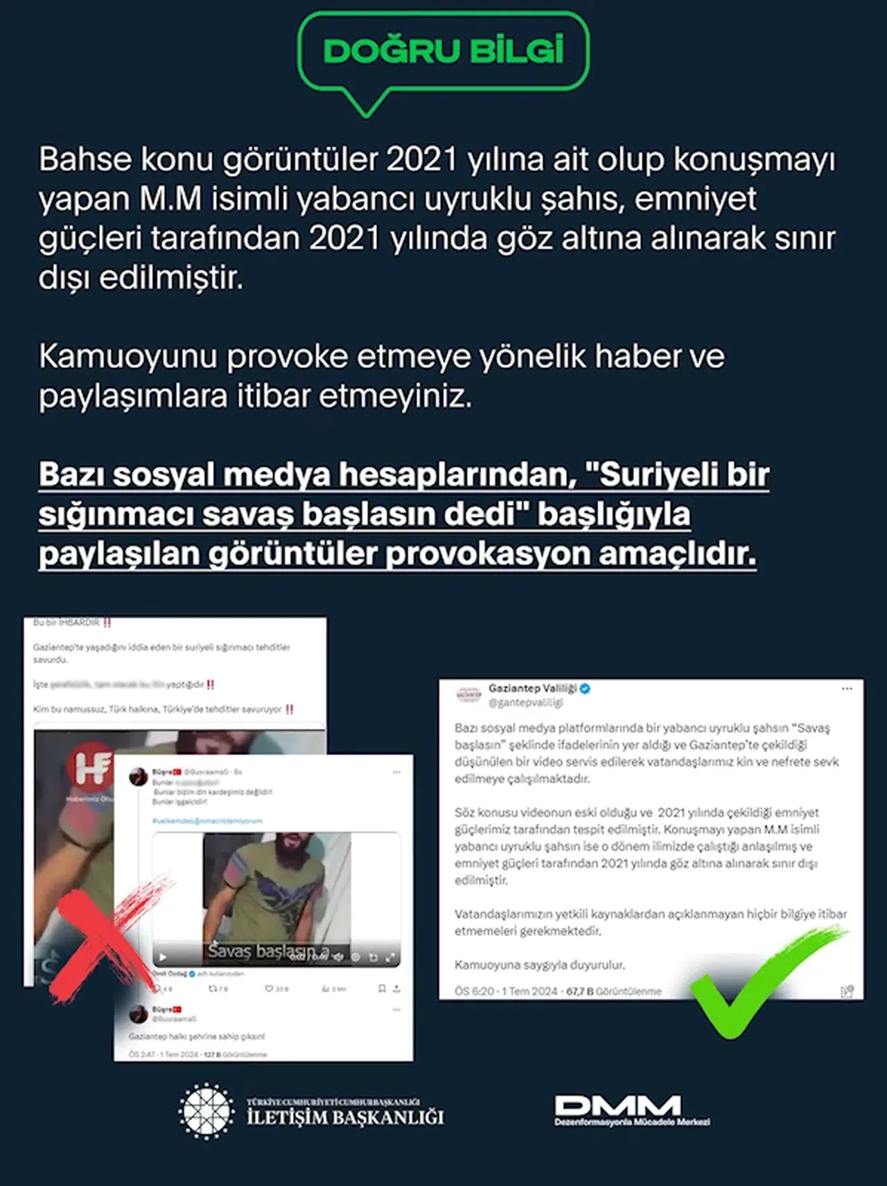 ANKARA, (DHA)- İLETİŞİM Başkanlığı Dezenformasyonla Mücadele Merkezi (DMM), sosyal medya hesabından yaptığı açıklamada, "Bazı sosyal medya hesaplarından, 'Suriyeli bir sığınmacı savaş başlasın dedi' başlığıyla paylaşılan görüntüler provokasyon amaçlıdır. Bahse konu görüntüler 2021 yılına ait olup konuşmayı yapan M.M. isimli yabancı uyruklu şahıs, emniyet güçleri tarafından 2021 yılında gözaltına alınarak sınır dışı edilmiştir. Kamuoyunu provoke etmeye yönelik haber ve paylaşımlara itibar etmeyiniz" ifadeleri yer aldı. (DHA)