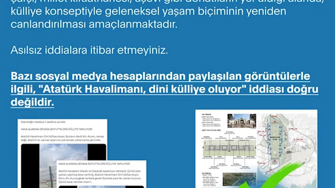 DMM'nin sosyal medya hesabından yapılan açıklamada, "Bazı sosyal medya hesaplarından paylaşılan görüntülerle ilgili, 'Atatürk Havalimanı, dini külliye oluyor' iddiası doğru değildir. Bahse konu görüntülerdeki yapı dini bir külliye değil, İstanbul Atatürk Havalimanı Millet Bahçesi proje alanında yapımı devam eden külliye konseptindeki alanı göstermektedir. Kuzey ve güney yerleşkesinde atölye, sergi salonları, lokanta, çarşı, millet kıraathanesi, aşevi gibi donatıların yer aldığı alanda, külliye konseptiyle geleneksel yaşam biçiminin yeniden canlandırılması amaçlanmaktadır" ifadelerine yer verildi. (DHA)