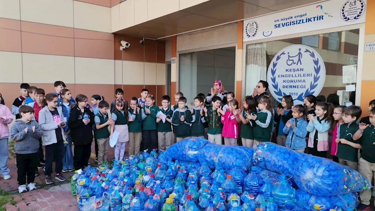 Ünsal YÜCEL/KEŞAN(Edirne),(DHA)-EDİRNE’nin Keşan ilçesinde Raşit Efendi İlkokulu öğrencileri 10-16 Mayıs Engelliler Haftası kapsamında yıl boyu topladıkları 220 kilogram mavi kapağı yetkililere teslim etti.