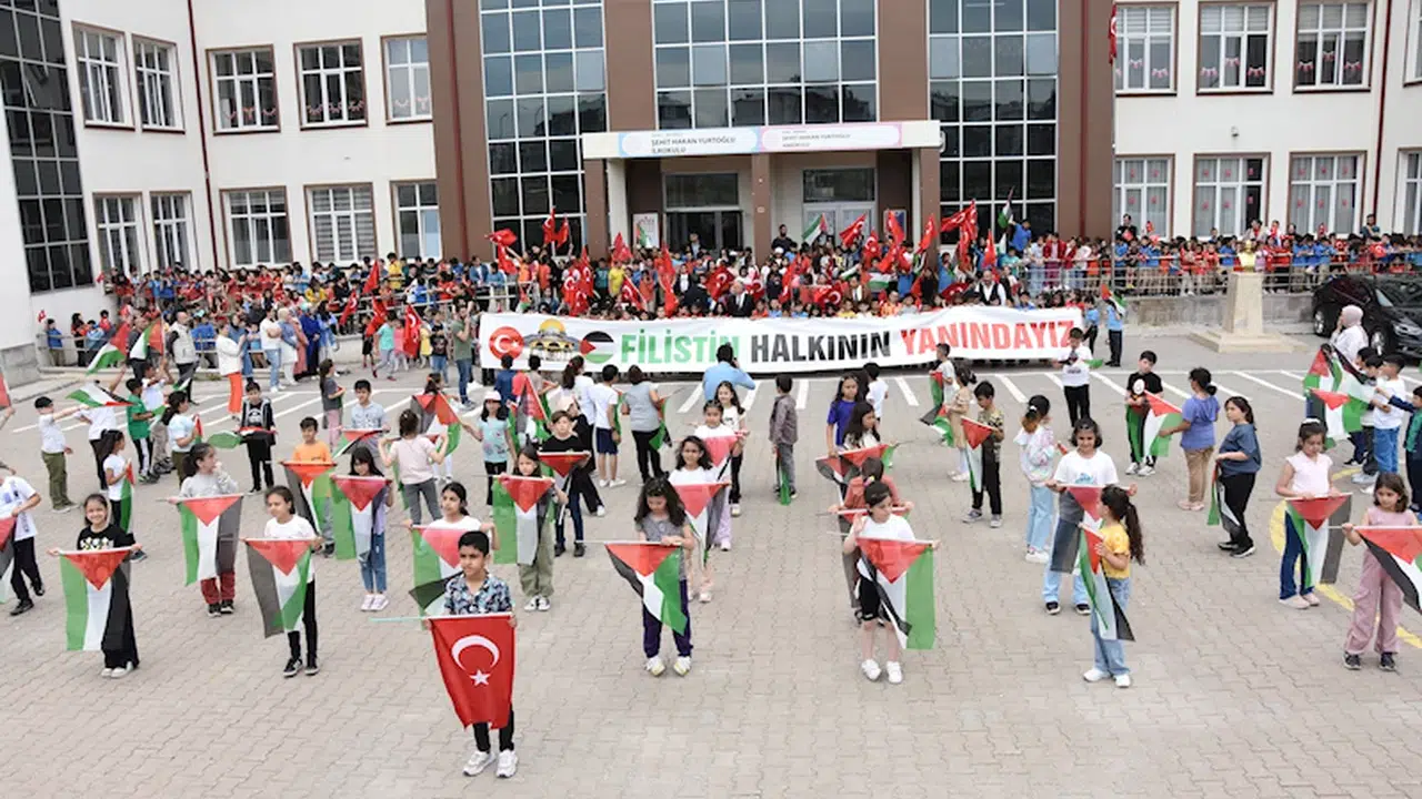 Şehit Hakan Yurtoğlu İlkokulu öğrencileri, okul bahçesinde toplanarak ‘Filistin Halkının Yanındayız’ pankartı açtı. Türk ve Filistin bayrakları taşıyan öğrenciler, Filistin'e özgü dans figürleri sergiledi. Öğrenciler ayrıca dans ederken söylenen şarkıya da eşlik etti. İl Milli Eğitim Müdürü Necati Yener'in de katıldığı etkinlikte öğrencilerin dansı beğeni topladı.