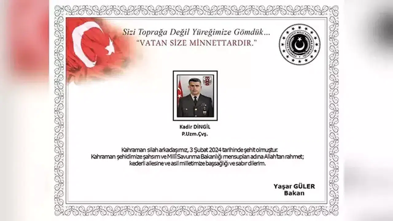 Bakanlıktan yapılan açıklamada, "Irak kuzeyi harekat bölgesinde 3 Şubat 2024 tarihinde bölücü terör örgütü mensupları tarafından yapılan taciz atışı sonucu kahraman silah arkadaşımız Piyade Uzman Çavuş Kadir Dingil şehit olmuş, iki kahraman silah arkadaşımız yaralanmıştır. Yaralılarımız derhal hastaneye sevk edilerek tedavilerine başlanmıştır. Bizleri derin bir acı ve üzüntüye boğan bu olayda hayatını kaybeden aziz şehidimize Allah'tan rahmet, kederli ailesine, Türk Silahlı Kuvvetleri ile asil milletimize başsağlığı ve sabır, yaralılarımıza da acil şifalar dileriz" denildi.