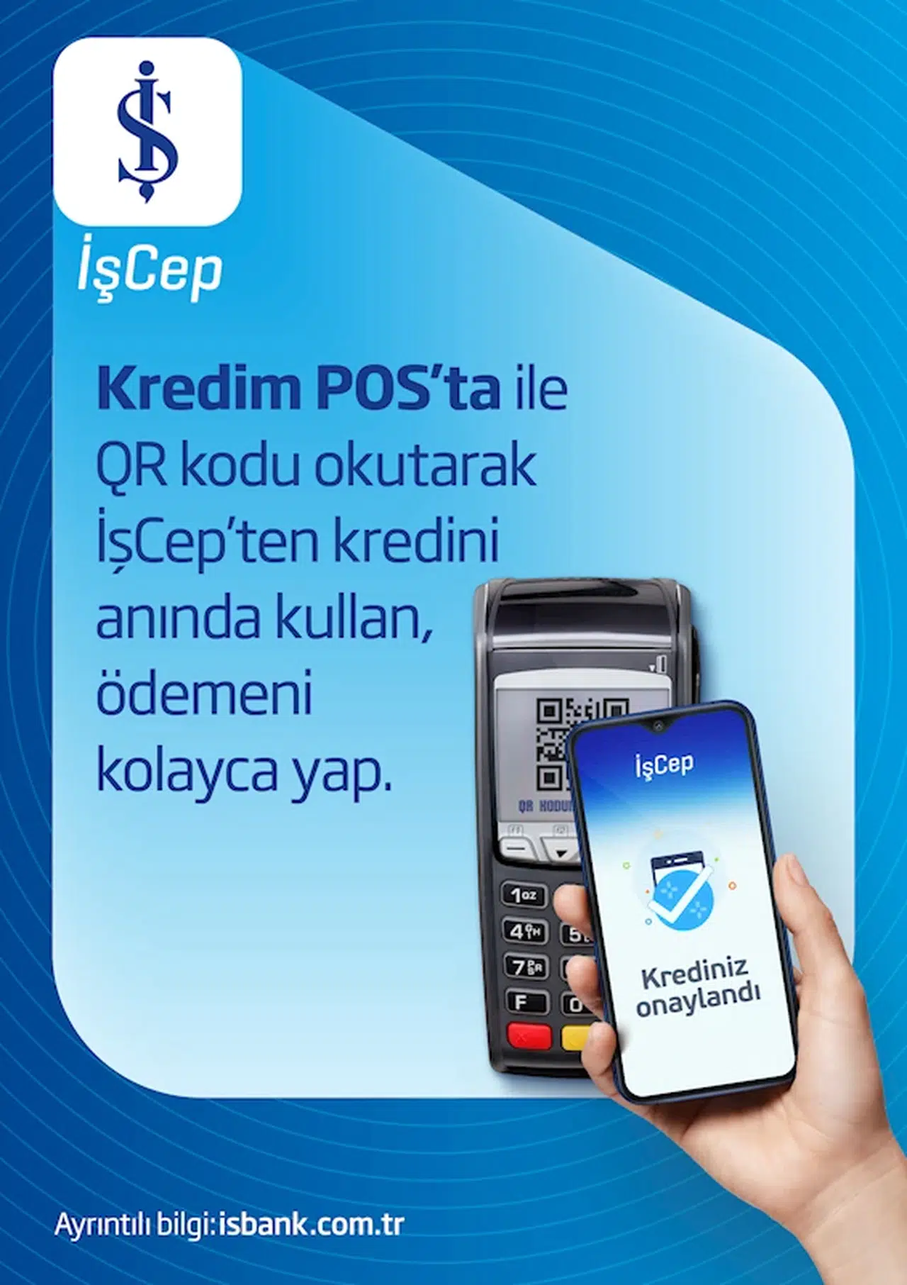 Banka müşterileri, Kredim POS’ta ile anlaşmalı mağazalarda ödeme anında POS cihazında oluşturulan QR kodu telefonlarından okutarak İşCep'ten kendilerine uygun kredi seçeneklerinden Anında Kredi veya Taksitli Ek Hesap kullanabiliyor.