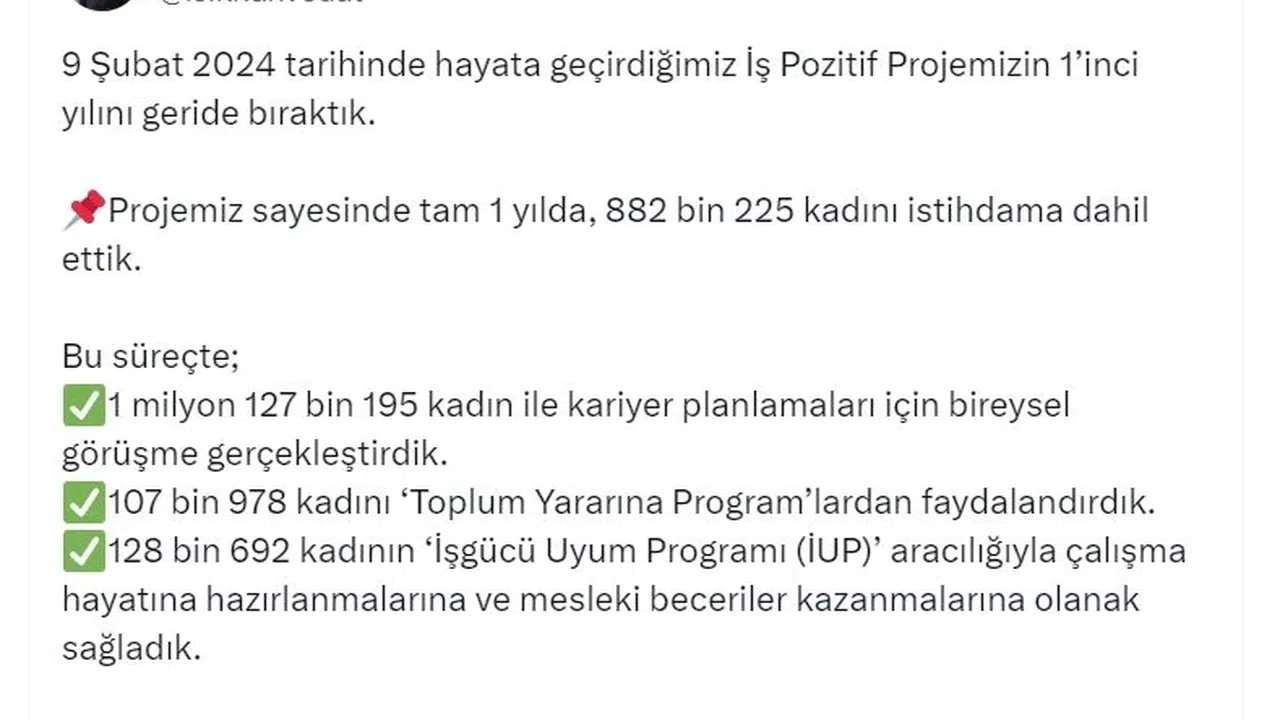 Gizem ÇORLU/ANKARA, (DHA)- ÇALIŞMA ve Sosyal Güvenlik Bakanı Vedat Işıkhan, İş Pozitif Projesi'nin 1'inci yılında 882 bin 225 kadını istihdama dahil ettiklerini duyurdu.
