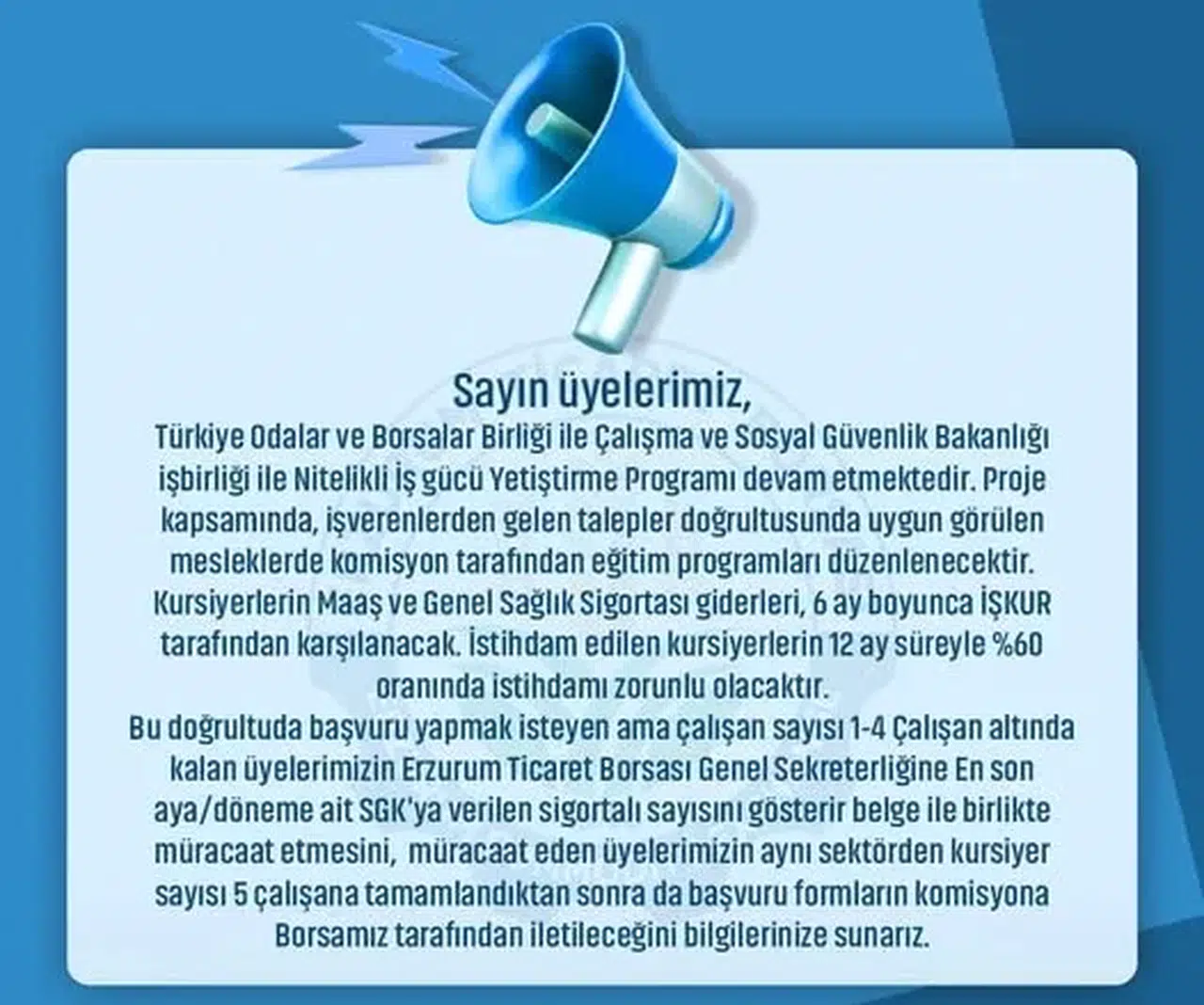 Başvuru yapmak isteyen, çalışan sayısı 1-4 arasında olan üyelerimizin, Erzurum Ticaret Borsası Genel Sekreterliği’ne son döneme ait sigortalı sayısını gösterir belge ile başvuru yapmaları gerektiği bildirildi. Aynı sektörden başvuru yapan kursiyer sayısı 5’e ulaştığında başvurular, Borsamız aracılığıyla komisyona iletilecek.