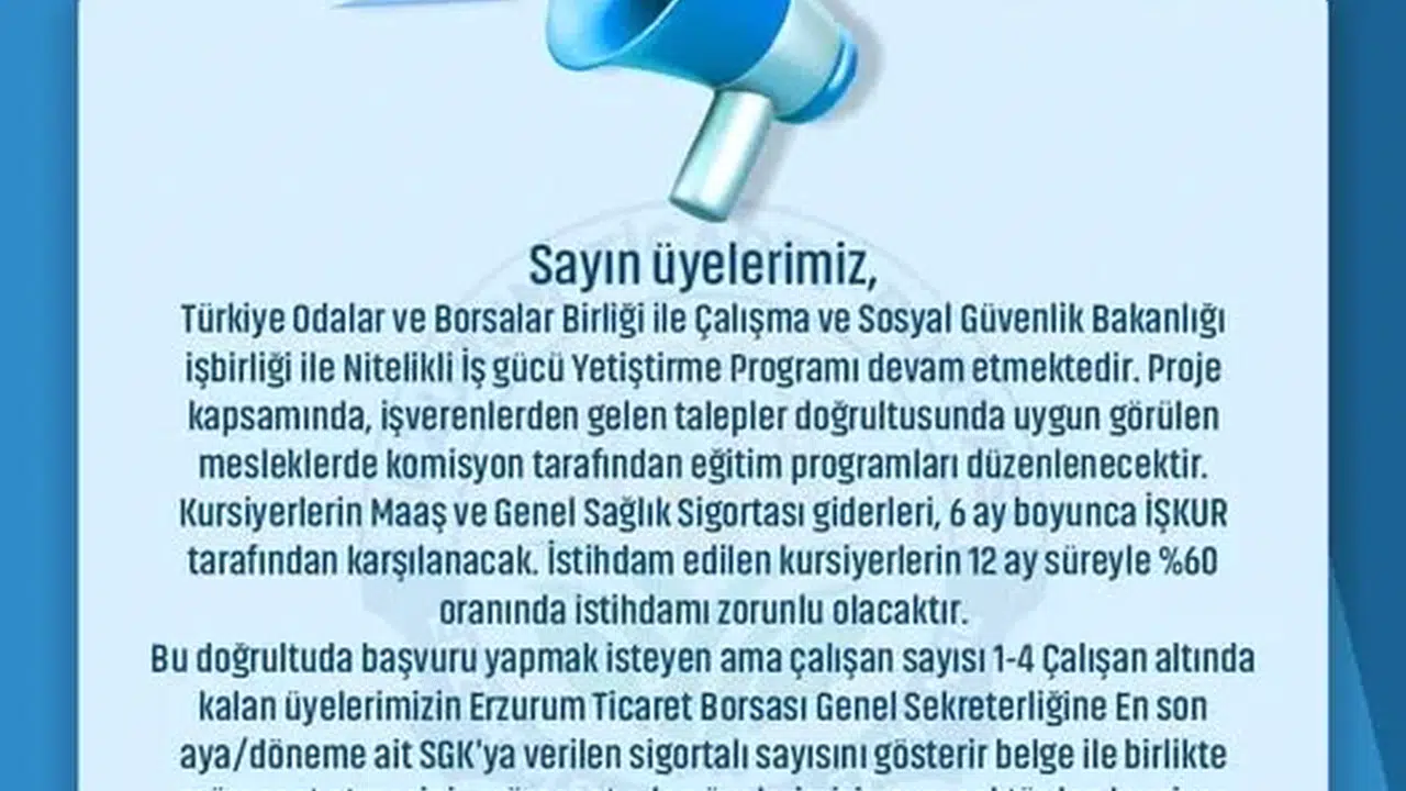 Türkiye Odalar ve Borsalar Birliği ile Çalışma ve Sosyal Güvenlik Bakanlığı işbirliğiyle yürütülen Nitelikli İş Gücü Yetiştirme Programı kapsamında yeni eğitim fırsatları sunuluyor. Proje çerçevesinde, işverenlerin talepleri doğrultusunda seçilen mesleklerde eğitim programları düzenlenecek.