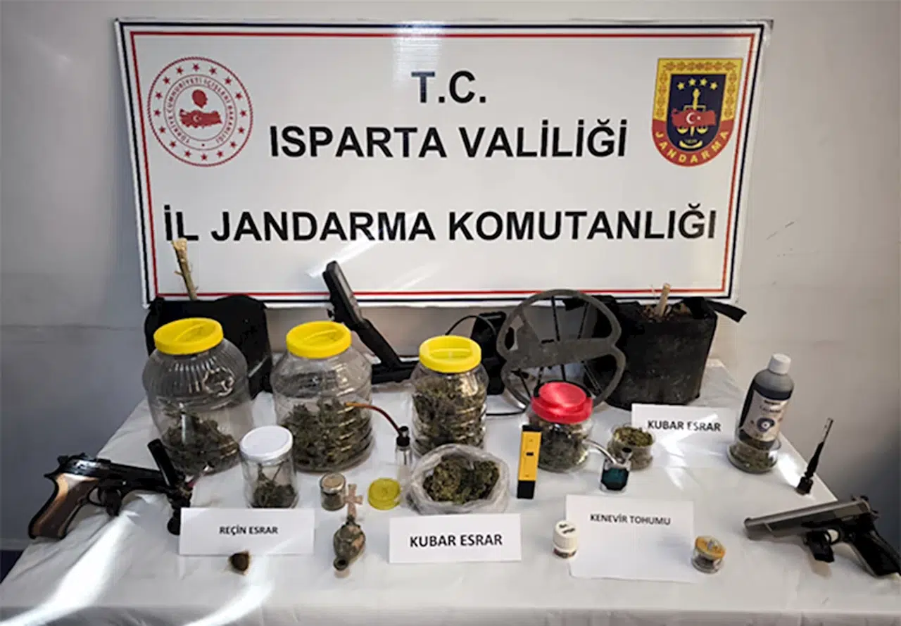 Isparta İl Jandarma Komutanlığı ekipleri Yalvaç ilçesinde 3 şüphelinin evinde uyuşturucu madde imal ve ticareti yaptıkları bilgisi üzerine operasyon başlattı. Evlerde yapılan aramada 255 gram kubar esrar, 8 gram reçine esrar, 2 kök kenevir bitkisi, 8 gram kenevir tohumu, esrar maddesi öğütme aparatı, 2 tabanca ve tarihi obje ele geçirildi. Şüpheliler hakkında 'uyuşturucu madde kullanma ve bulundurma', 'yasa dışı kenevir ekimi' ve '2863 sayılı kültür ve tabiat varlıklarını koruma kanununa muhalefet' suçlarından adli işlem başlatıldı. (DHA)