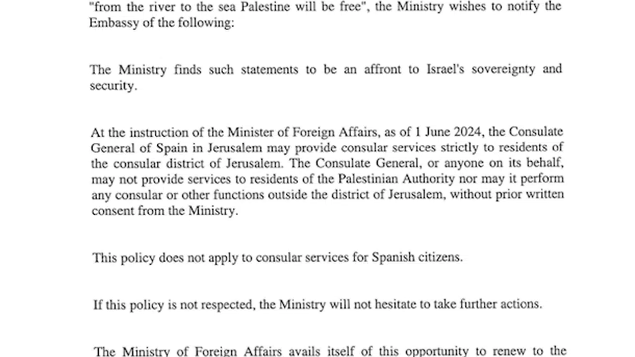 İsrail Dışişleri Bakanlığı, Kudüs’teki İspanya Büyükelçiliğine bir mektup yazarak İspanyol yetkililerin ‘kışkırtıcı ve nefret dolu antisemitik açıklamaları’ nedeniyle İspanyol vatandaşı olmayan Filistinlilere hizmet vermesini yasakladığını duyurdu. Mektupta, “Dışişleri Bakanı'nın talimatı üzerine, 1 Haziran 2024 tarihinden itibaren İspanya'nın Kudüs Başkonsolosluğu, yalnızca Kudüs'ün konsolosluk bölgesi sakinlerine konsolosluk hizmetleri sunabilecektir. Başkonsolosluk veya onun adına herhangi bir kişi, Bakanlığın önceden yazılı izni olmadan Filistinlilere hizmet veremez. Bu politika İspanyol vatandaşlarına yönelik konsolosluk hizmetleri için geçerli değildir. Bu politikaya uyulmaması halinde Bakanlık daha ileri adımlar atmaktan çekinmeyecektir” ifadeleri yer aldı. İspanya Dışişleri Bakanı Albares, dün Filistin Başbakanı ve Dışişleri Bakanı Muhammed Mustafa ile görüşmüş ve İspanya’nın 28 Mayıs’ta Filistin Devletini resmi olarak tanıyacağını duyurmuştu