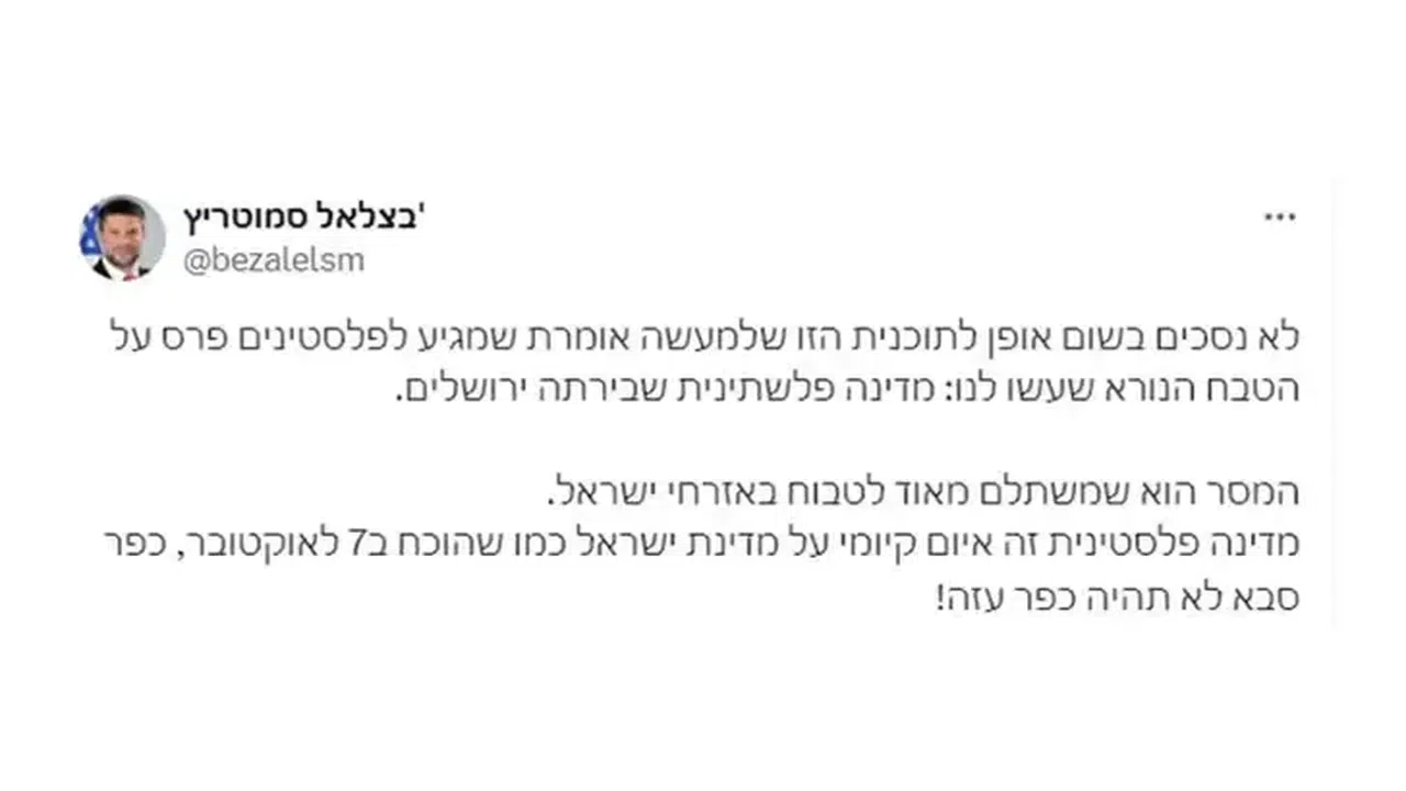 İsrail Maliye Bakanı Smotrich, yaptığı açıklamada, “Filistinlilerin bize yaptıkları korkunç katliam için bir ödülü hak ettiklerini söyleyen bu planı hiçbir şekilde kabul etmeyeceğiz; başkenti Kudüs olan bir Filistin devleti. Verilmek istenen mesaj, İsrail vatandaşlarını katletmenin karşılığının çok iyi olduğudur. Bir Filistin devleti, 7 Ekim'de kanıtlandığı üzere İsrail Devleti için varoluşsal bir tehdittir” dedi.