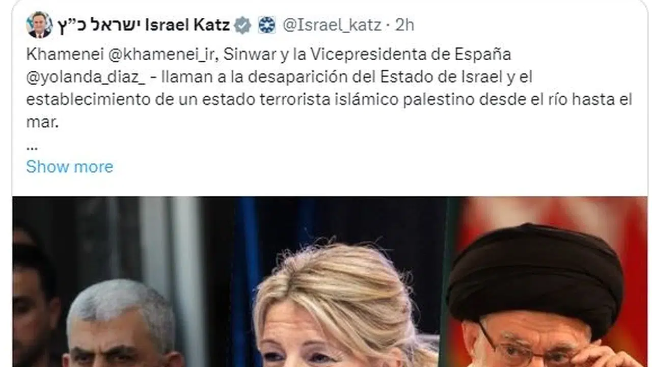 İsrail Dışişleri Bakanı Yısrael Katz, İspanya Hükümeti’nin Filistin’i devlet olarak tanıma kararı sonrası açıklamalarda bulunarak, “İspanya Başkan Yardımcısı Yolanda Diaz, İsrail Devleti'nin ortadan kaldırılması ve nehirden denize kadar bir Filistin İslamcı terör devletinin kurulması çağrısında bulunuyor” ifadelerini kullanmıştı. Yolanda Diaz, açıklamalara tepki göstererek, “İnsan haklarına olan bağlılığımız herhangi bir tehdit nedeniyle durmayacaktır. Sesimizi kısmayacağız ya da hükümetimizin eylemlerini durdurmayacağız. Önemli olan tek şey ateşkesin sağlanması, savaş suçlarının kovuşturulması ve soykırımın durdurulmasıdır” dedi.