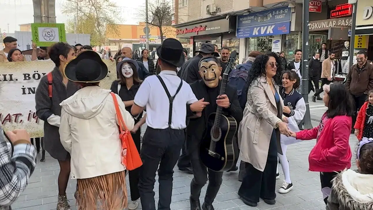 İhsan DÖRTKARDEŞ/İSTANBUL, (DHA)-AVCILAR'da buluşan amatör tiyatrocular, 'Dünya Tiyatrolar Günü'nü dans ederek kutladı. Kostümleriyle caddede yürüyen grup, sahneledikleri oyunlardan tiratlar da oynadı.