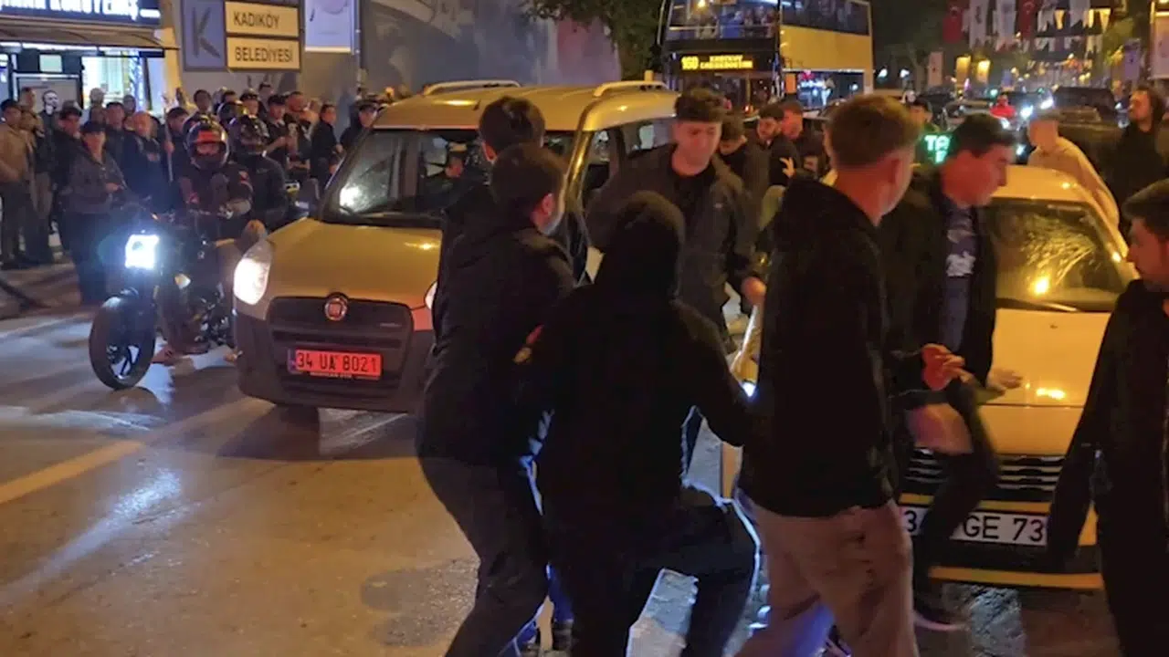 Galatasaray'ın şampiyonluğunu ilan etmesinin ardından bazı taraftarlar Bağdat Caddesi'nde konvoy yaptı. Bu sırada caddedeki Fenerbahçe taraftarları, camdan bayrak çıkaran Galatasaraylıların araçlarına taş ve şişe fırlattı. Galatasaraylıların araçlarına saldıran Fenerbahçelilere polis müdahale etti. (DHA)