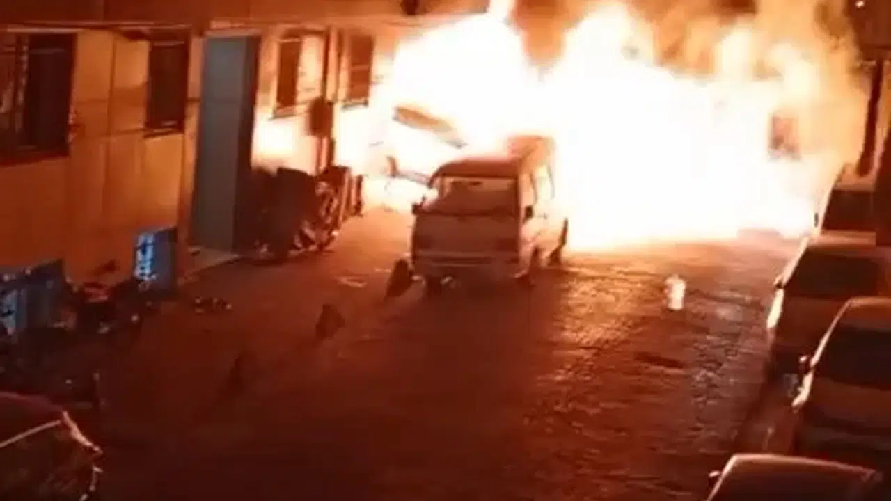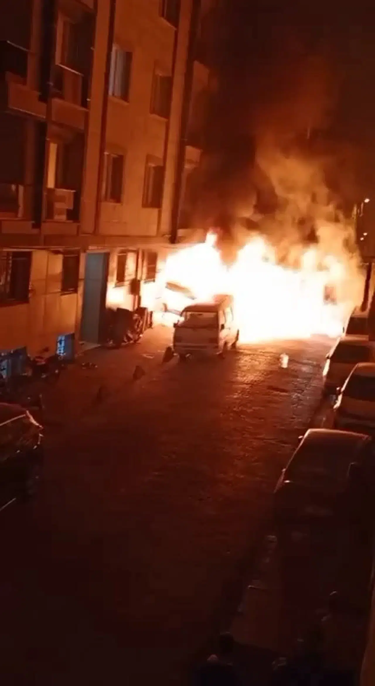 Yanan araçlardan yükselen alevler mahalle sakinlerinin cep telefonu kameralarına yansıdı. Görüntülerde, park halindeki araçlardan alevlerin yükseldiği mahalle sakinlerinin ise panik yaşadığı görülüyor.