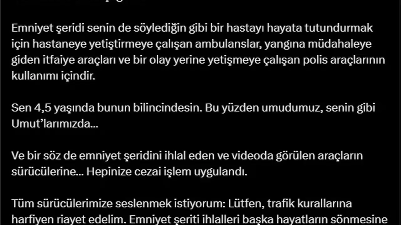 İçişleri Bakanı Ali Yerlikaya paylaşımında, "Aferin sana Umut'çuğum. Emniyet şeridi senin de söylediğin gibi bir hastayı hayata tutundurmak için hastaneye yetiştirmeye çalışan ambulanslar, yangına müdahaleye giden itfaiye araçları ve bir olay yerine yetişmeye çalışan polis araçlarının kullanımı içindir. Sen 4,5 yaşında bunun bilincindesin. Bu yüzden umudumuz, senin gibi Umut'larımızda. Ve bir söz de emniyet şeridini ihlal eden ve videoda görülen araçların sürücülerine… Hepinize cezai işlem uygulandı. Tüm sürücülerimize seslenmek istiyorum: Lütfen, trafik kurallarına harfiyen riayet edelim. Emniyet şeridi ihlalleri başka hayatların sönmesine neden olabilir" ifadelerine yer verdi. (DHA)