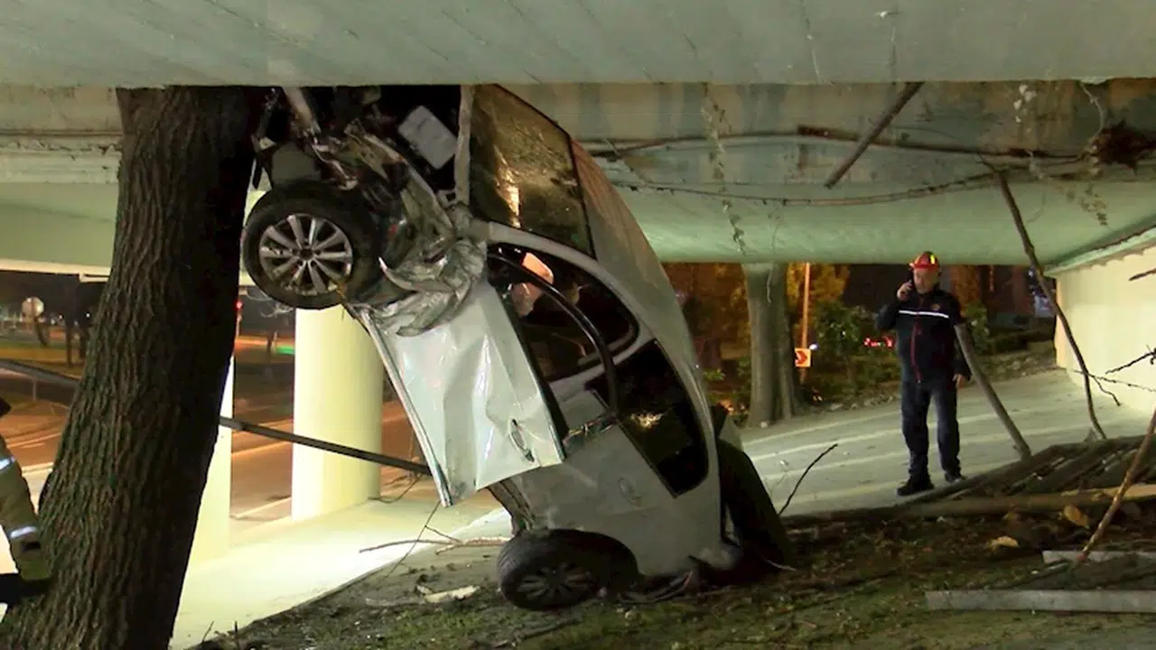 İstanbul- Bakırköy'de, alkollü sürücünün kullandığı otomobil viyadükten düşüp, ağaçta asılı kaldı