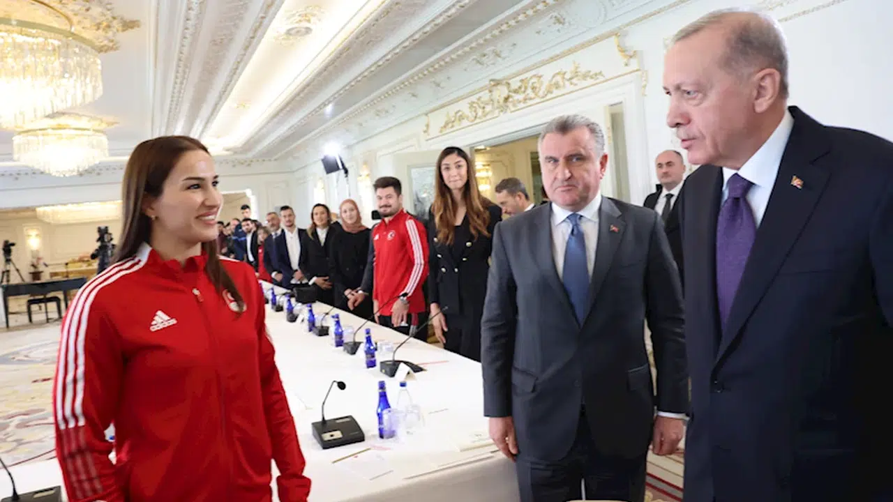 Türk gençlerinin son dönemde sporda elde ettiği başarılara dikkat çeken Erdoğan, "Bölgesinde ve dünyada yıldızı giderek parlayan Türkiye’nin sporda da başarı çıtasını sürekli yükseltmesinden memnuniyet duyuyoruz. Geleneksel olarak güçlü olduğumuz branşların da ötesine geçerek yeni spor dallarında kürsüye çıkmaya hatta kürsüyü domine etmeye başladık. Sporcularımız katıldıkları yarışmalardan artık madalyasız dönmüyor. Sporcularımız başarıları yanında centilmenlikleriyle de takdir kazanıyor. Ülke genelinde spor altyapısına son 21 yılda yaptığımız yatırımların, inşa ettiğimiz tesislerin, sporcularımıza verdiğimiz desteklerin boşa gitmediğini görmenin sevincini yaşıyoruz. Sporcularımızın uluslararası başarıları arttıkça gençlerimiz spora daha fazla yönelmeye, sporu bir kariyer olarak görmeye başladı. 2002 yılında toplam lisanslı sporcu sayımız 278 bin kişiyken bugün 15 milyon 550 bine yükseldi. 2002 yılında bütün spor dallarında aldığımız madalya sayısı bin 481 adet iken 2023 yılı sonu itibariyle bu rakam 7 bin 404’e yükseldi. Antrenör sayımız 18 bin 674’ten 321 bine, spor kulübü sayımız ise 6 bin 35’ten 25 bin 78’e çıktı. Türkiye olimpiyatlara hazırlık merkezlerinde bin 382 sporcumuz var. Son 7 yılda sporcu yetenek taramasıyla 7 milyon 706 bin evladımızın kabiliyetlerine baktık, buna göre yönlendirmede bulunduk. 2021 yılında devreye alınan milli sporcu bursuyla başarılı sporcularımızı akademik yolculuklarında da destekliyoruz" diye konuştu.