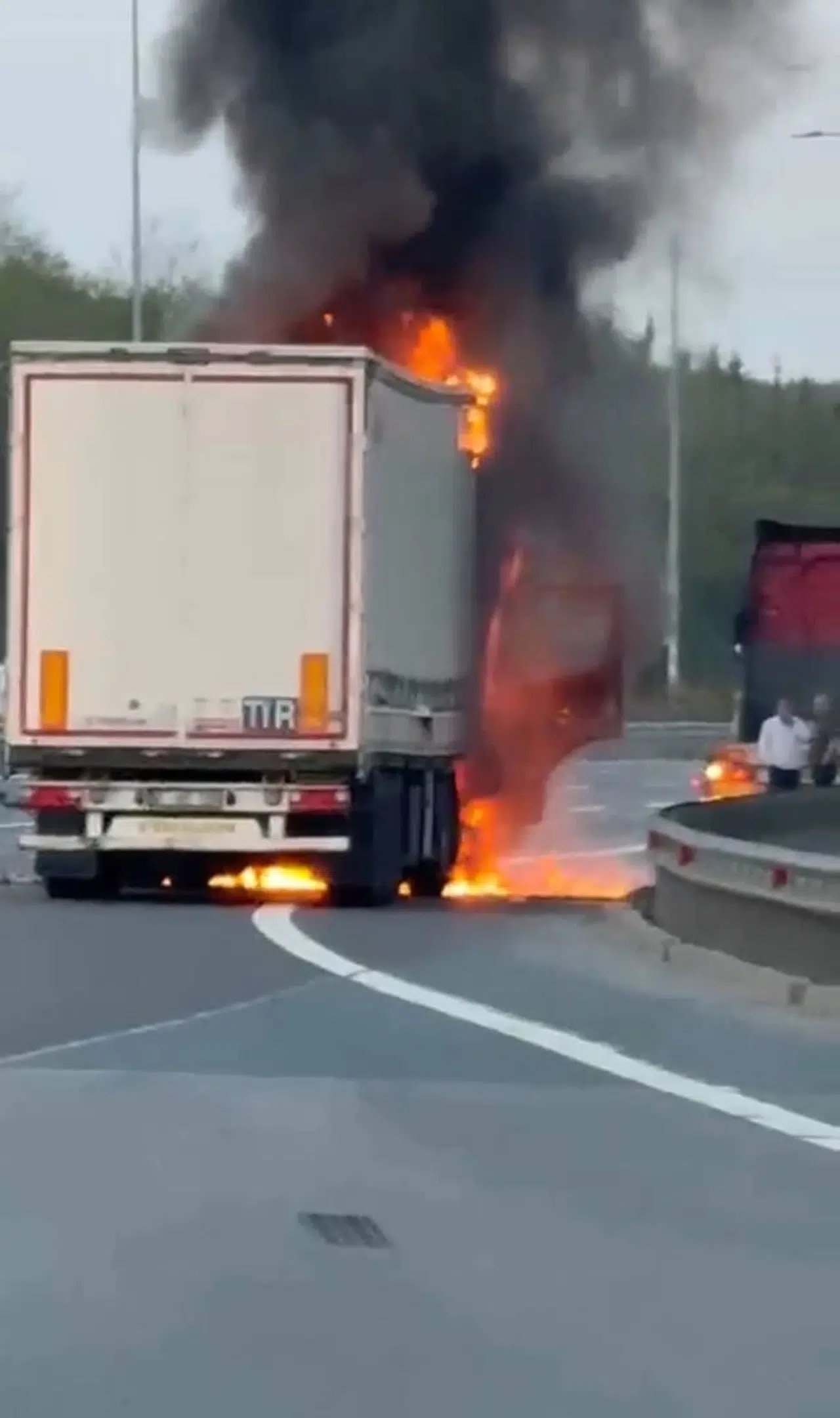 Yangın, saat 19.30 sıralarında Kuzey Marmara Otoyolu Işıklar mevkiinde seyir halinde olan TIR'ın motor bölümünde çıktı. Ankara istikametinde seyir halinde olan TIR'ın motor kısmında başlayan alevler kısa sürede büyüdü. İhbar üzerine olay yerine itfaiye ve jandarma ekipleri sevk edildi. Jandarma ekipleri çevrede güvenlik önlemi alırken, itfaiye ekipleri yangını söndürmek için çalışma başlattı. Kısa sürede kontrol altına alınan yangın itfaiye ekipleri tarafından söndürüldü. Yanan TIR ise kullanılamaz hale geldi. (DHA)