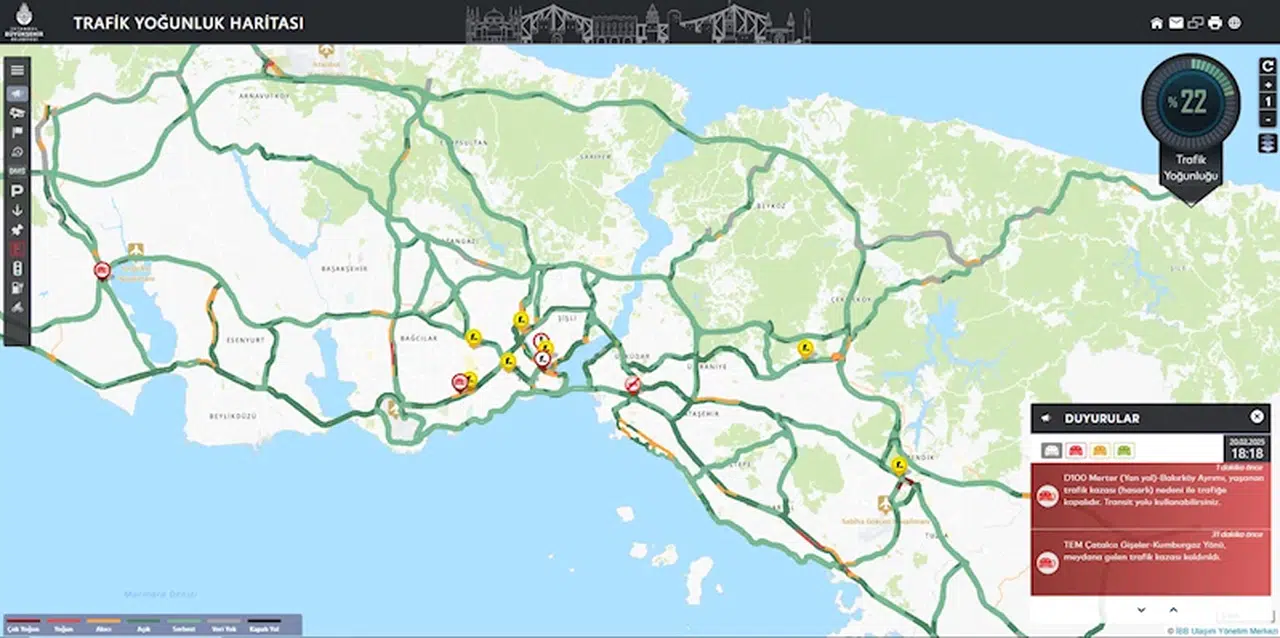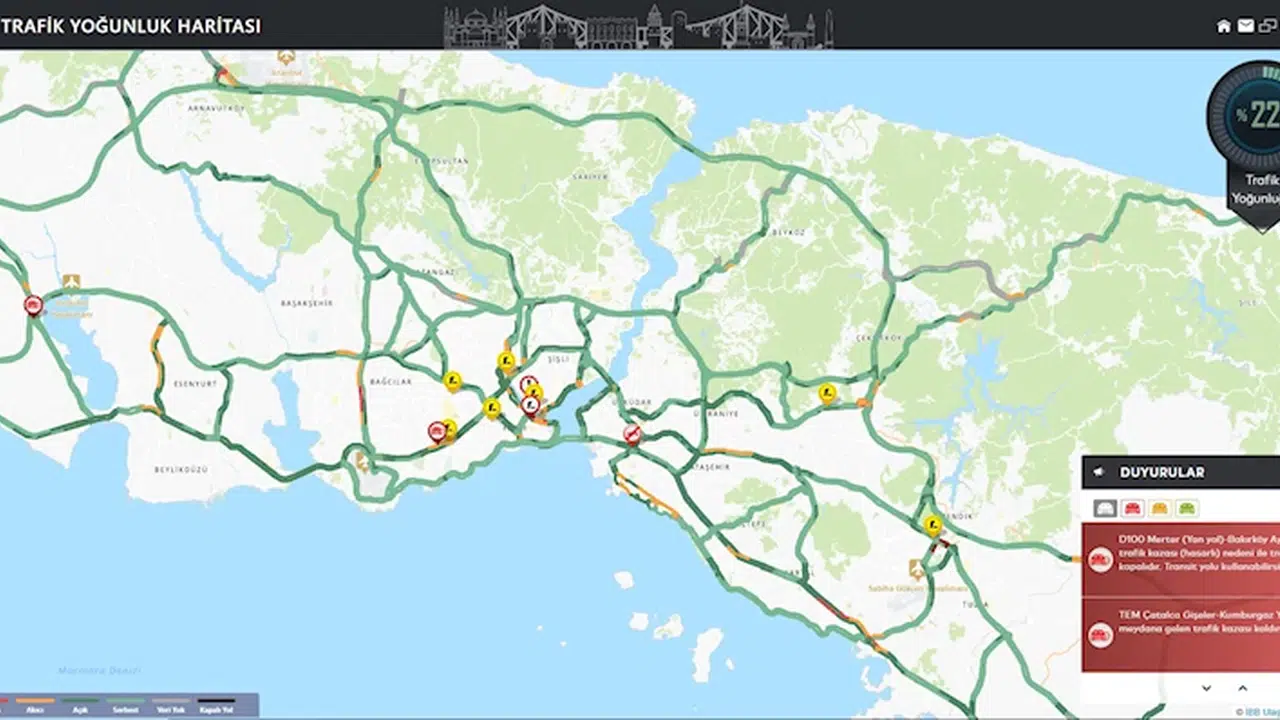 İstanbul'da dün öğle saatlerinde başlayan kar yağışı ile birlikte yollarda yoğunluk oluştu. Trafik yoğunluğu akşam iş çıkış saatinde yüzde 90'a ulaştı. Ana arterlerde trafik durma noktasına gelirken, vatandaşlar evlerine gitmekte güçlük yaşadı. Dersini alan İstanbul halkı, bugün işe giderken toplu taşıma araçlarını kullanmayı tercih etti. Trafiğin en yoğun olduğu, iş çıkış saati olan 18:30'da trafik yoğunluğu yüzde 22 olarak ölçüldü. (DHA)